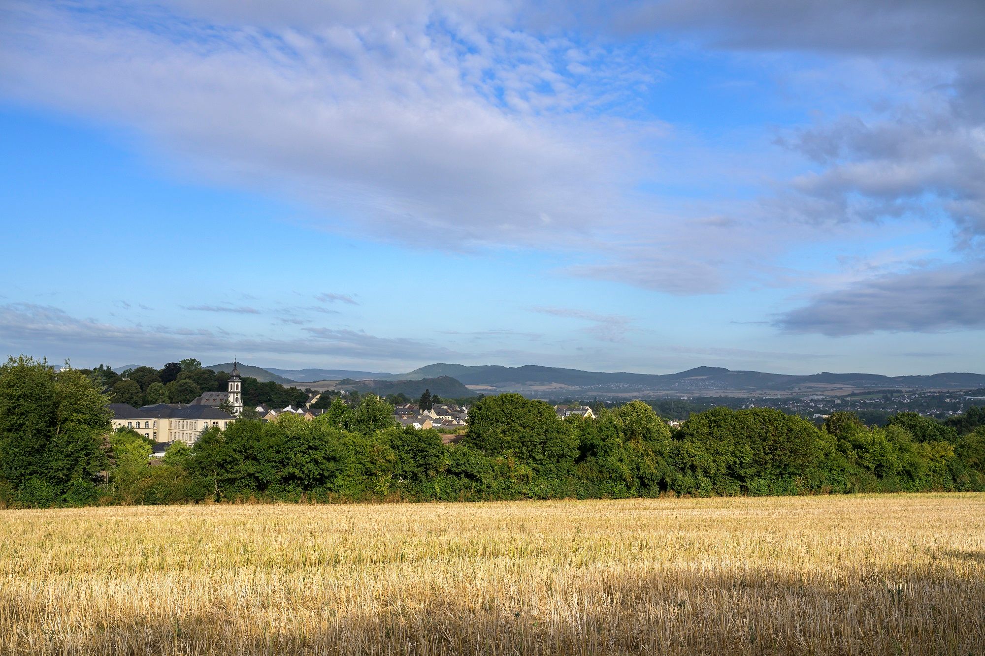 Neem vanaf het dorpsplein de hoofdweg bergafwaarts langs de indrukwekkende barokkerk St Cäcilia naar de begraafplaats. Als je de weg naar de begraafplaats volgt, kom je op een landweggetje dat aan het einde kort omhoog loopt. Houd links aan bij de onderdoorgang en neem het volgende pad direct naar links. Het pad leidt je door idyllische velden naar de landweg (L123), die je een klein stukje volgt en vervolgens oversteekt. Ga verder langs landweggetjes, houd links aan bij de volgende splitsing en volg het pad omlaag naar een weiland in een klein bos. Daar zie je een imposante "Säulenhallen". Ga verder de "Kreuzberg" af langs talrijke wegkruisen en neem het tweede pad rechts. Op het volgende voetpad heb je een prachtig uitzicht op het dorp en de Barrockkerk. Houd aan het einde van het pad twee keer links aan en volg het pad langs een weiland naar een klein park. Steek dit over en je komt bij de Pöschstraße. Houd daar rechts aan voordat je linksaf slaat de Neuwieder Straße in, die terug naar het dorpsplein leidt.