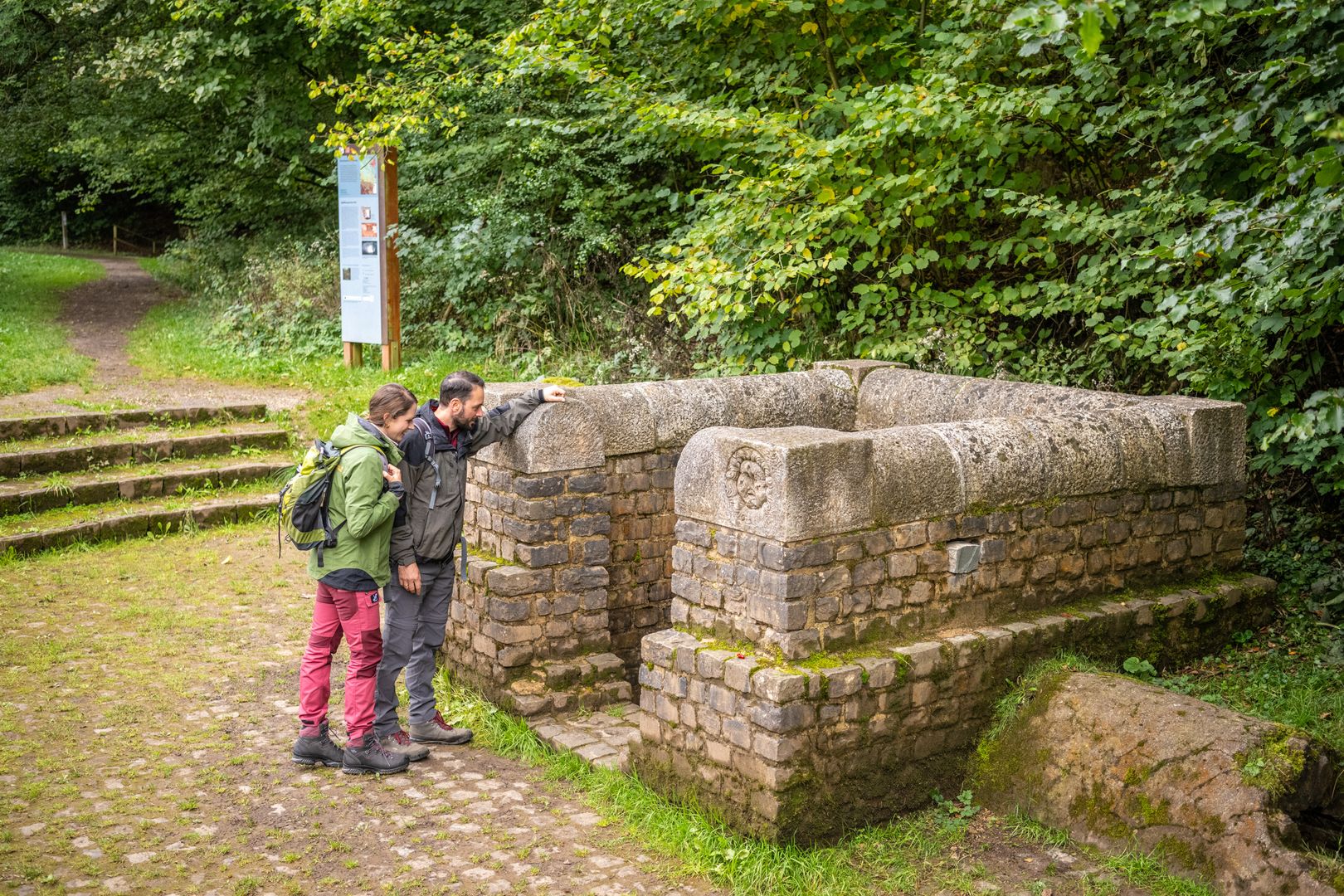 Op deze Eifelsteig-etappe beleef je de verleden tijd vanaf de Romeinen tot de Middeleeuwen. Start is het middeleeuwse klooster Steinfeld. Je laat de stilte van de kloostermuren achter je en wandelt naar beneden naar het dal van de Gillesbach. Na de aansluitende beklimming van de Königsberg word je beloond met uitzicht op de in de wijde omtrek zichtbare torens van het achterliggende klooster Steinfeld. Beschut door dichte boomkruinen wandel je verder tot je een oude bekende ontmoet - tenminste als je al de Eifelsteig-etappe 5 hebt gelopen: het riviertje de Urft, dat door de beemden van het dal slingert, houdt je nu weer een hele poos gezelschap. Maar de Urft is niet het enige water hier, want al snel bereik je een opvallend ommuurde bron. Water is de oorsprong van het leven - de Romeinen wisten deze bijzondere natuurschat al te waarderen en beschermden hem hier bij de Grüner Pütz. Om het kostbare water van de Eifel veilig naar Keulen te brengen legden de Romeinen zelfs een eigen leiding aan. Deze bron wordt bovendien bewaakt door Medusa's - maar pas op! Want volgens de legende mag je hen niet in de ogen kijken, anders versteen je en verga je tot stof.
