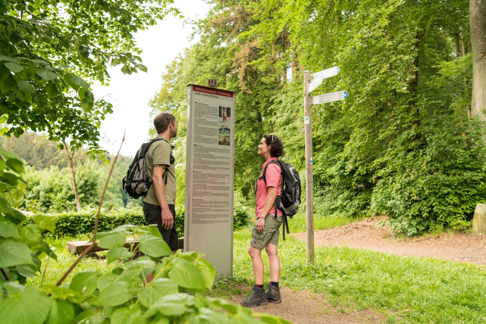 De eerste stappen zet je in het schilderachtige Kylldal, zacht gekabbel van het kleine riviertje begeleidt je en brengt je op dreef voor de dag. Dan wordt het rotsachtiger, een beek kronkelt steen voor steen door het dal, soms zelfs als kleine waterval. Om je heen oorspronkelijke natuur, wild groen, je voelt je een beetje alsof je op een expeditie bent. Je vraagt je af: hoe kom ik aan de andere kant van de beek? Dan ontdek je de brede stenen waarmee je met droge voeten over het water komt. En niet alleen hiermee. Hangbruggen overspannen het glinsterende water hier in het Butzerbachdal. Wiebelen ze een beetje? Heel licht maar en de bodem is in zicht, dat red je makkelijk en je vindt het leuk. (Opmerking: Het gedeelte door de vallei van Butzerbach is gesloten. Een omleiding is aangegeven) Na het wild-romantische dal valt je een merkwaardig bouwwerk op: lijkt op een kleine mijn, midden in de natuur? Inderdaad, het is een Romeinse mijn met de naam 'Pützlöcher'. Soms is de deur naar de mijn open en als je het durft, kun je in de oude gangen rondkijken en je laten terugverplaatsen naar oude tijden. Je wandelt verder door het rotsachtige landschap en ontdekt in een van de rotsen een raam! Kan dat waar zijn? Ja. Daarachter verbergt zich in het bontzandsteen de Klausengrot, ooit de woonplaats van een kluizenaar. Als je wilt, kun je via een ladder in de grot klimmen. En dan komt het: een imposante gekleurde rots met ingehouwen trappen. Je bent nieuwsgierig, beklimt trede voor trede en boven aangekomen ben je omgeven door rotsen en opent zich een nieuw perspectief op de omgeving. Dat is het uitzicht vanuit de Genovevagrot, je voelt je klein en verheven tegelijk. Je benut de indrukwekkende sfeer en last een korte pauze in, dan ga je verder. Na het dramatische rotslandschap volgt een ontspannen deel door het dal van Biewer. Maar waar een dal is, gaat het ook weer een keer bergopwaarts - en het is de moeite waard. Een smal rotspad voert je boven de Moezel door bijna mediterraan landschap. Warme dennenlucht stijgt in je neus op en je hebt al in de gaten dat je doel Trier niet meer ver is. De eerste monumentale bouwwerken kun je al zien: de Römerbrücke gaat over de Moezel, de zogenaamde Basilika (een Romeinse hallenkerk) valt op in het stadsbeeld. Hoe dichter je bij het doel komt, des te trotser word je. Je hebt de etappe volbracht - en misschien zelfs 313 kilometer Eifelsteig! 15 etappen, door de hele Eifel. Maar het voelt alsof je wandel-time-out veel langer heeft geduurd!