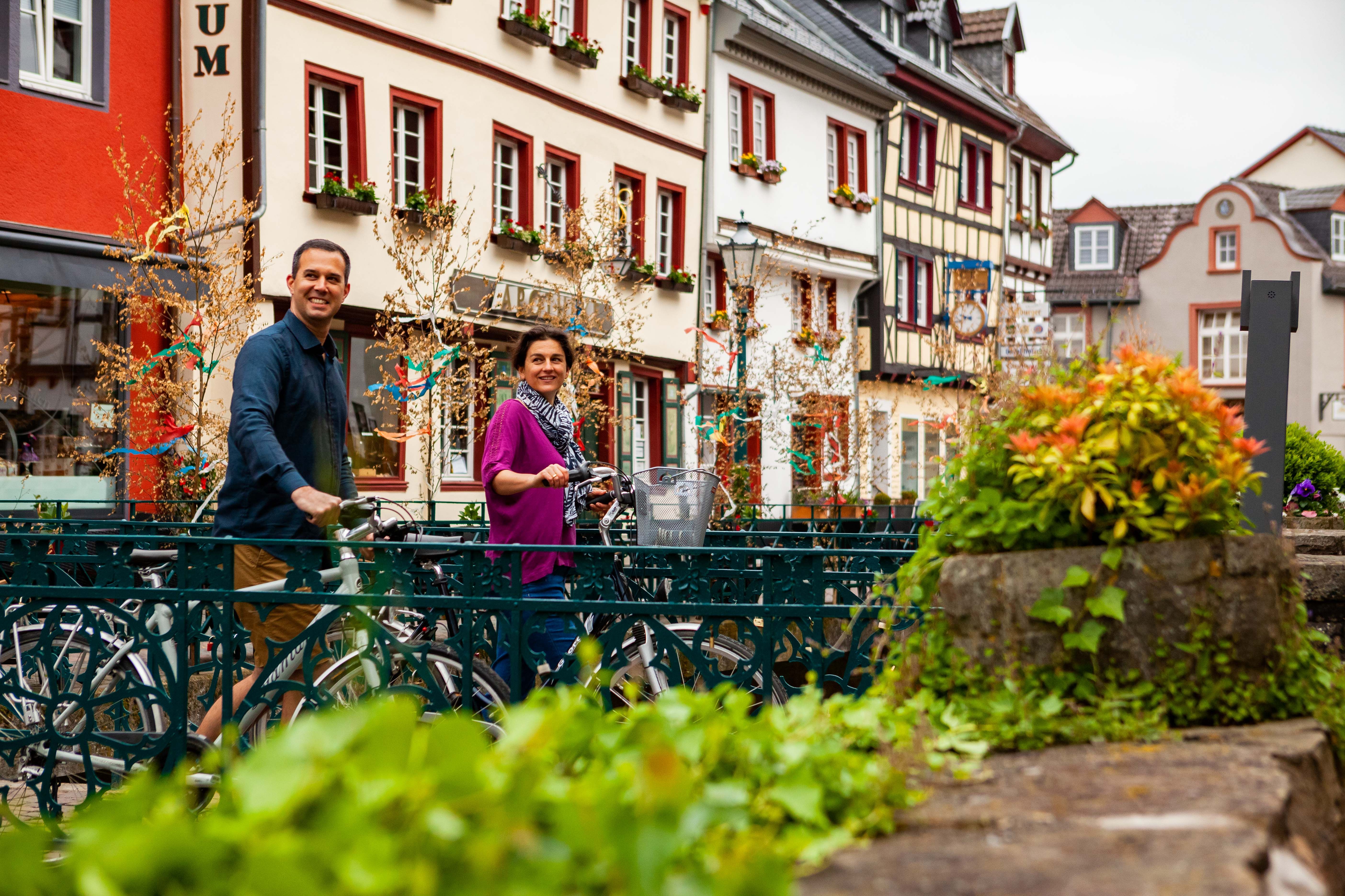 Zo ook in Bad Münstereifel, waar je in het historische voetgangersgebied kunt bezoeken. En we gaan verder door de laatste ‘uitlopers’ van het natuurpark Noord-Eifel. Houten bruggen leiden over de schijnbaar ongerepte oevers van de Erft. Deels lopen de takken tot in de rivier en de oever is begroeid met dicht struikgewas. De volgende bestemming is Euskirchen, waar behalve een spaarvarken-monument verschillende sculpturen, beelden en de nog resterende historische stadsmuren te ontdekken vallen. Ook het thermen- en zwemparadijs van Euskirchen is de moeite waard.