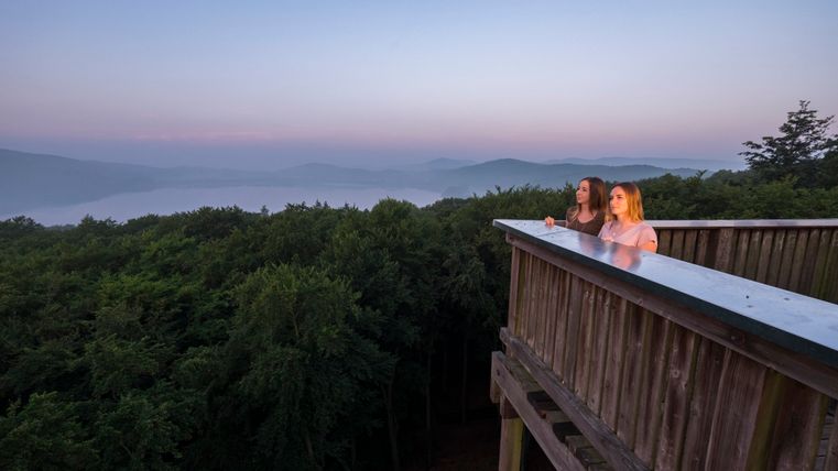 Volg nu de hooggelegen rondwandeling gedurende ongeveer 15 minuten, voorbij een kruis en een afslag naar de Lorenzfelsen-rots. Je komt bij een schuilplaats op een kruising. Twee paden vertakken zich naar links, neem het pad aan de rechterkant. Iets bergafwaarts, even later bij een splitsing van het pad, links aanhouden en verder bergafwaarts. Het pad buigt dan naar links, waar 2 paden bergafwaarts afbuigen. Hier voegt de Vulkaaneifelweg (V) zich van rechts bij het N-pad. Blijf op het N pad en volg het pad in de richting van het "Vulkan Waldfrieden" restaurant. Steek de weg voor het restaurant over (wandeltijd 1 uur). Passeer het restaurant aan de rechterkant en neem het N-pad (wegwijzer "Lydiaturm"). Loop achter het restaurant langs en na een paar stappen bereik je de uitkijktoren. De 132 treden naar het platform zijn de moeite waard, want je hebt een uitzicht over het Laacher meer en in het achterland naar Wassenach en Burgbrohl.