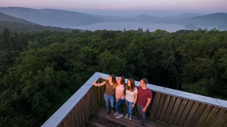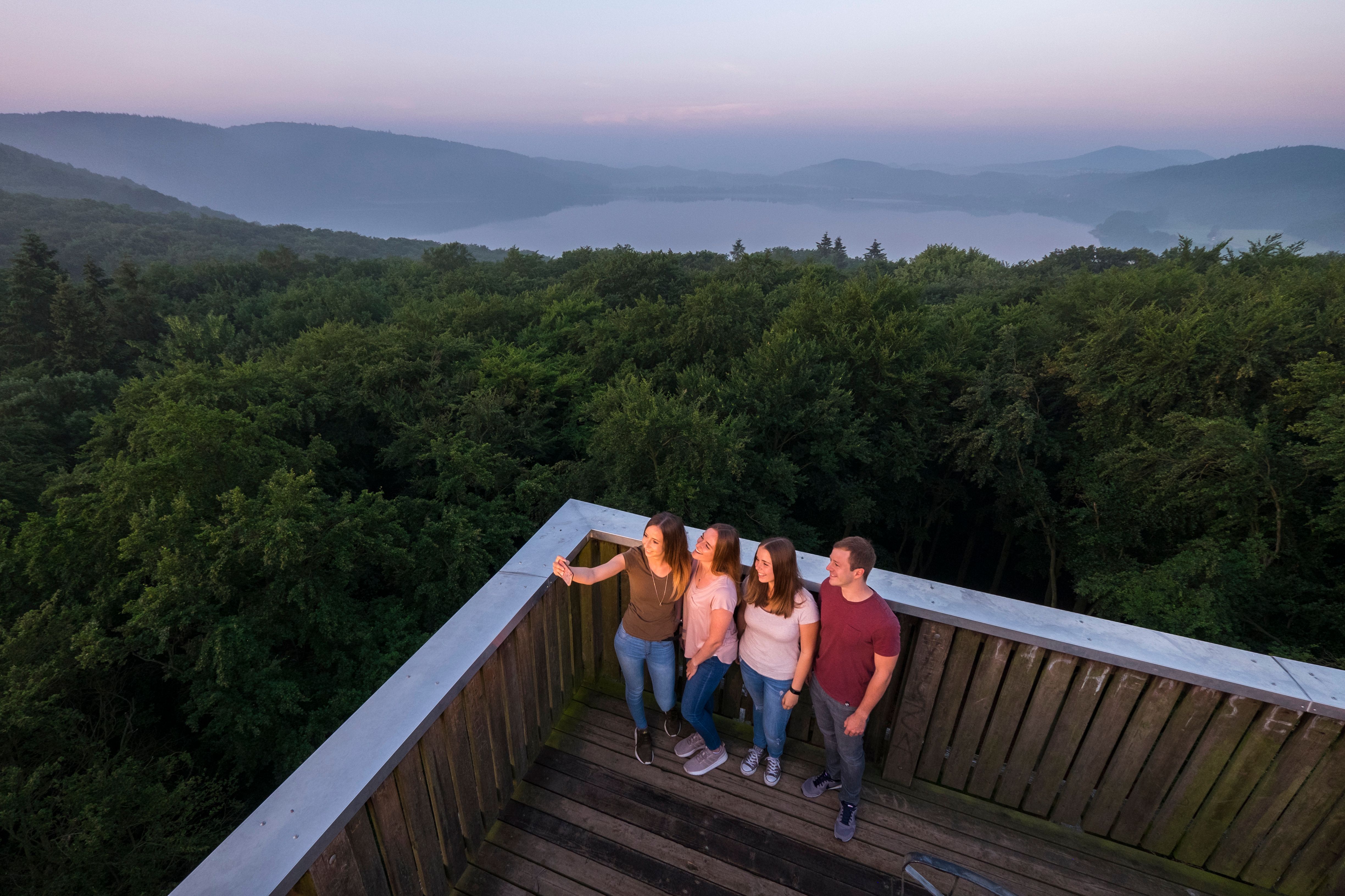 "Lydia Tower" uitkijktoren: Vanaf de Lydia toren heb je een indrukwekkend uitzicht op de caldera "Laacher See". Een caldera is een ingestorte krater gevormd door het leeglopen van de magmakamers onder de vulkaankegel. De laatste uitbarsting van de vulkaan Laacher See was ongeveer 13.000 jaar geleden.