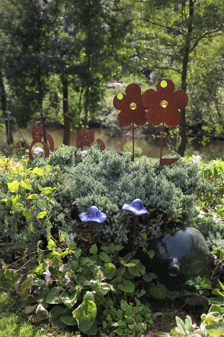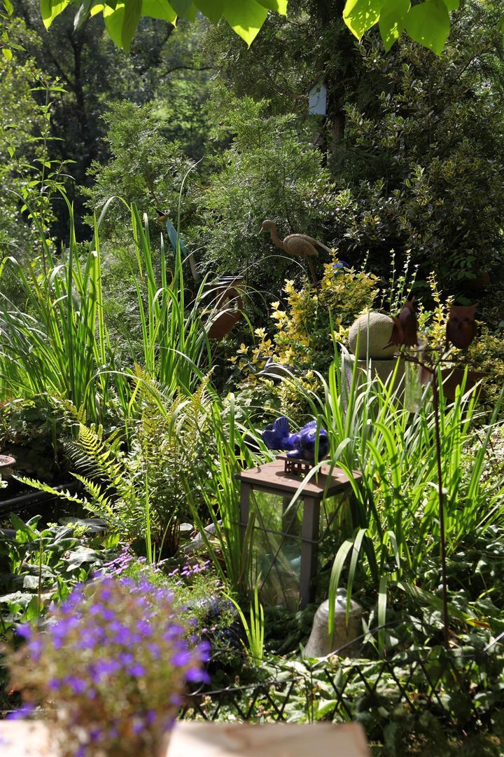 • Een kleurrijke tuin met groene planten en blauwe bloemen. Metalen bloemenornamenten staan op de voorgrond.