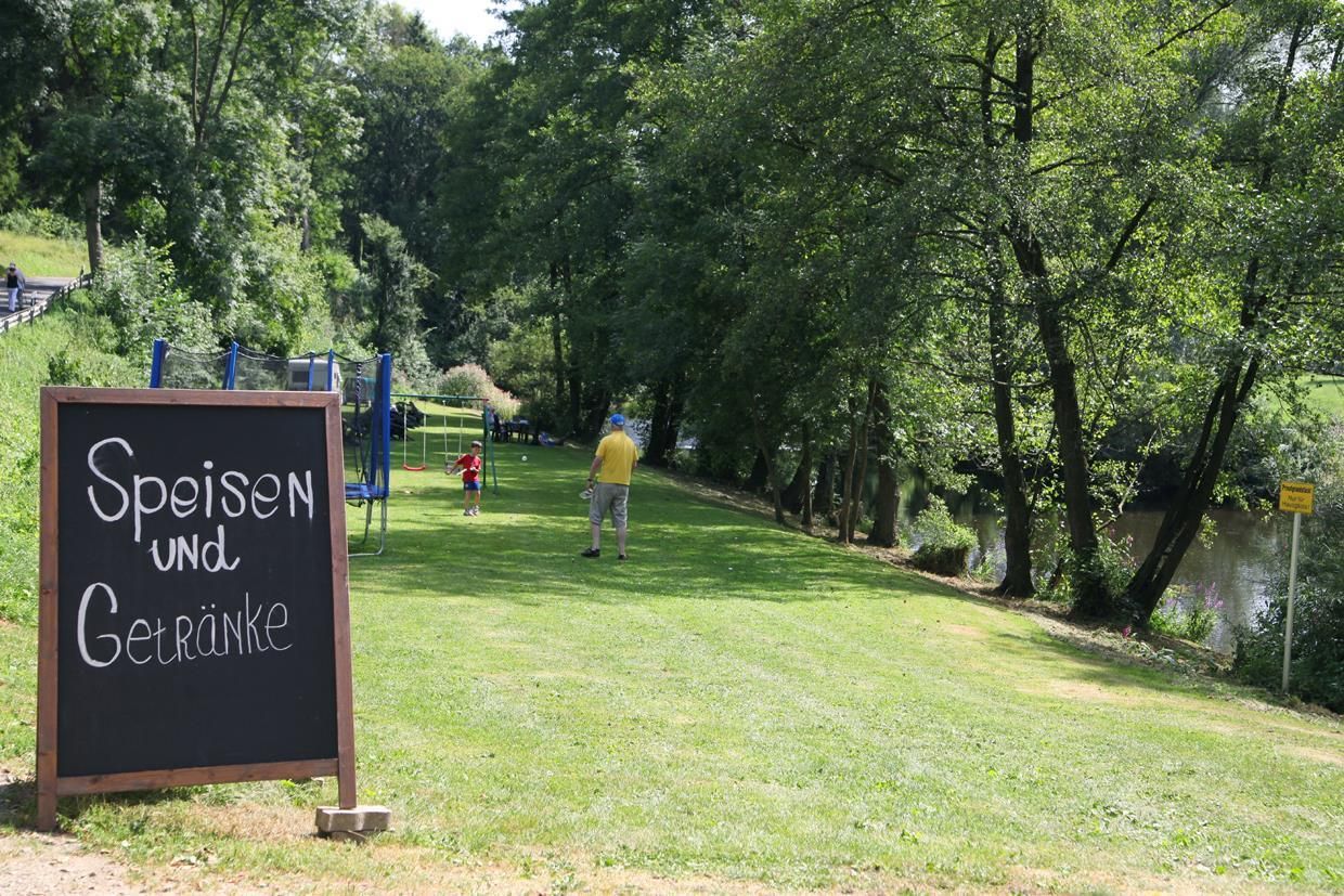 • Een klein park aan de rivier met een grasveld en schaduwrijke bomen. Een bord geeft "Eten en drinken" aan.