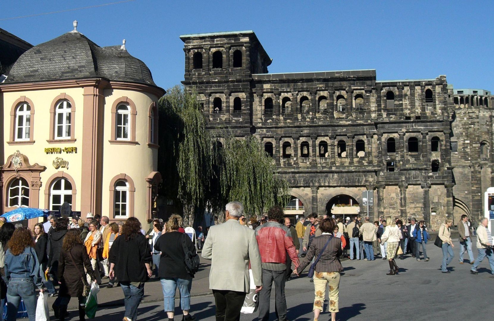 • Een druk plein met veel mensen en historische gebouwen. Op de achtergrond staat een oude stenen gevel.
