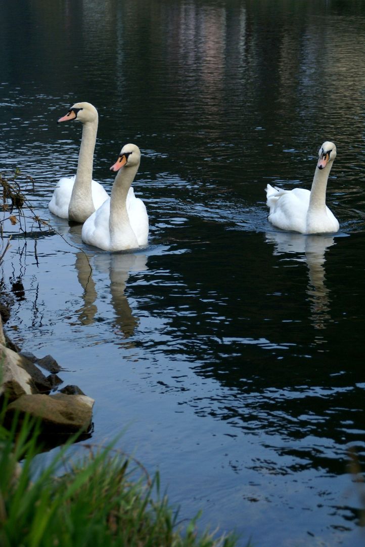 • Drie zwanen zwemmen rustig op een stille water. Hun weerspiegelingen zijn op het wateroppervlak te zien.