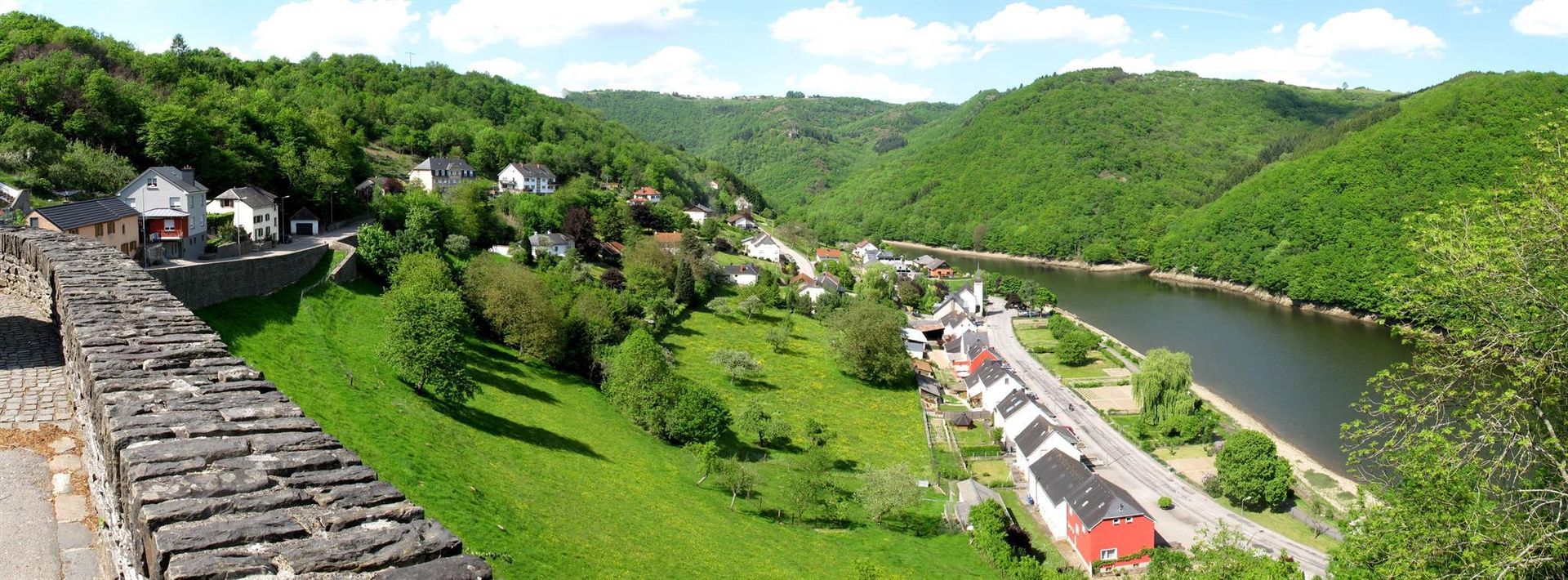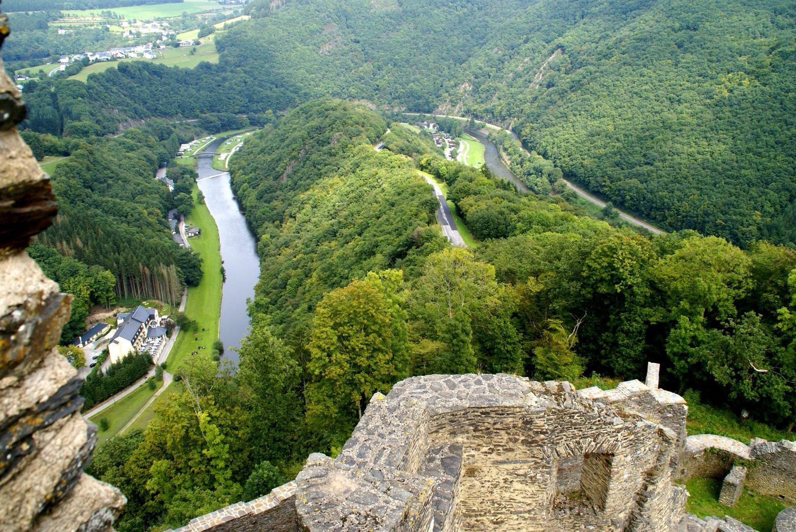 • Een blik vanaf een oude kasteelruïne op een groene landschap. Op de achtergrond stroomt een rivier en loopt langs de heuvel.