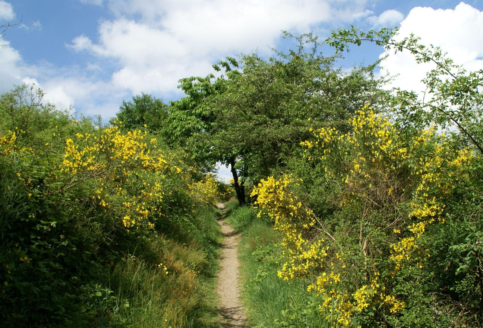 • Een smal pad, omgeven door kleurrijke gele bloemen en groene struiken. De lucht is blauw met enkele witte wolken.