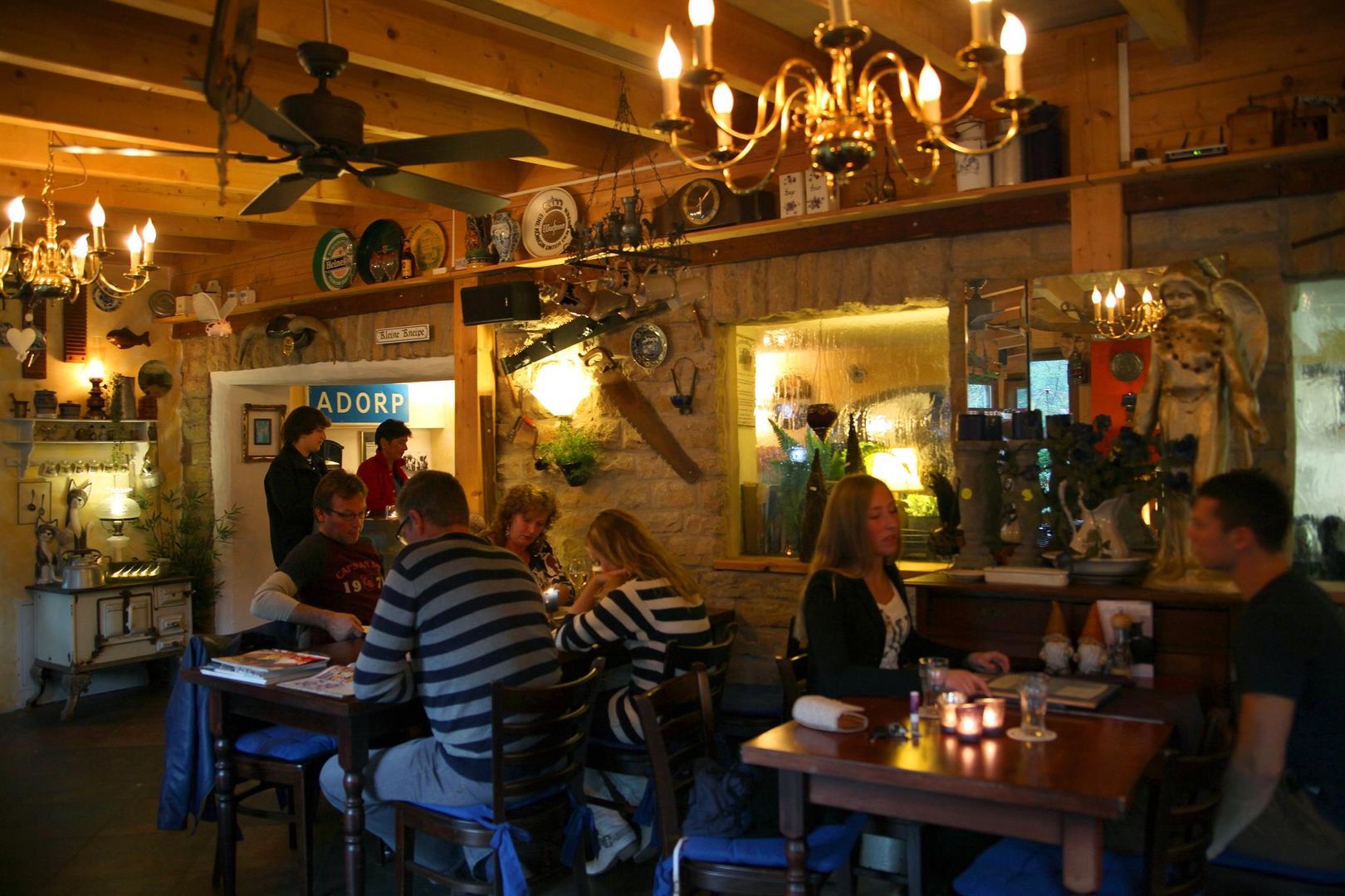 • Een gezellig restaurant met houten decor en warm licht. Gasten zitten aan tafels en genieten van hun tijd in een uitnodigende sfeer.