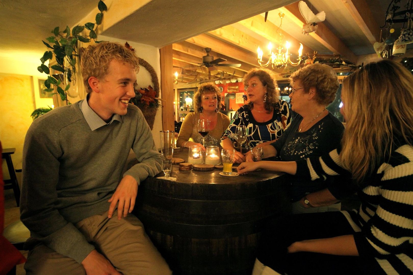 • Een gezellige groep van vijf personen in een sfeervol restaurant. Ze zitten rond een tafel en hebben een vrolijk gesprek.
