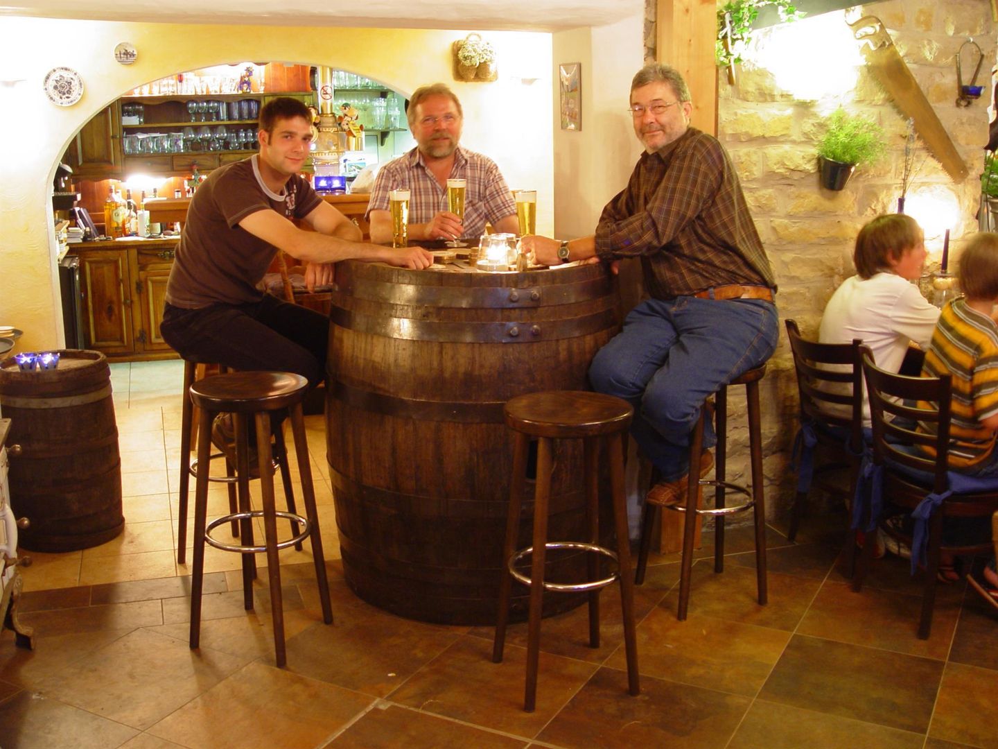 • Drie mannen zitten aan een ronde tafel van houten vaten in een gezellige bar. Op de achtergrond zijn er planken met drankjes en een vriendelijke sfeer te zien.