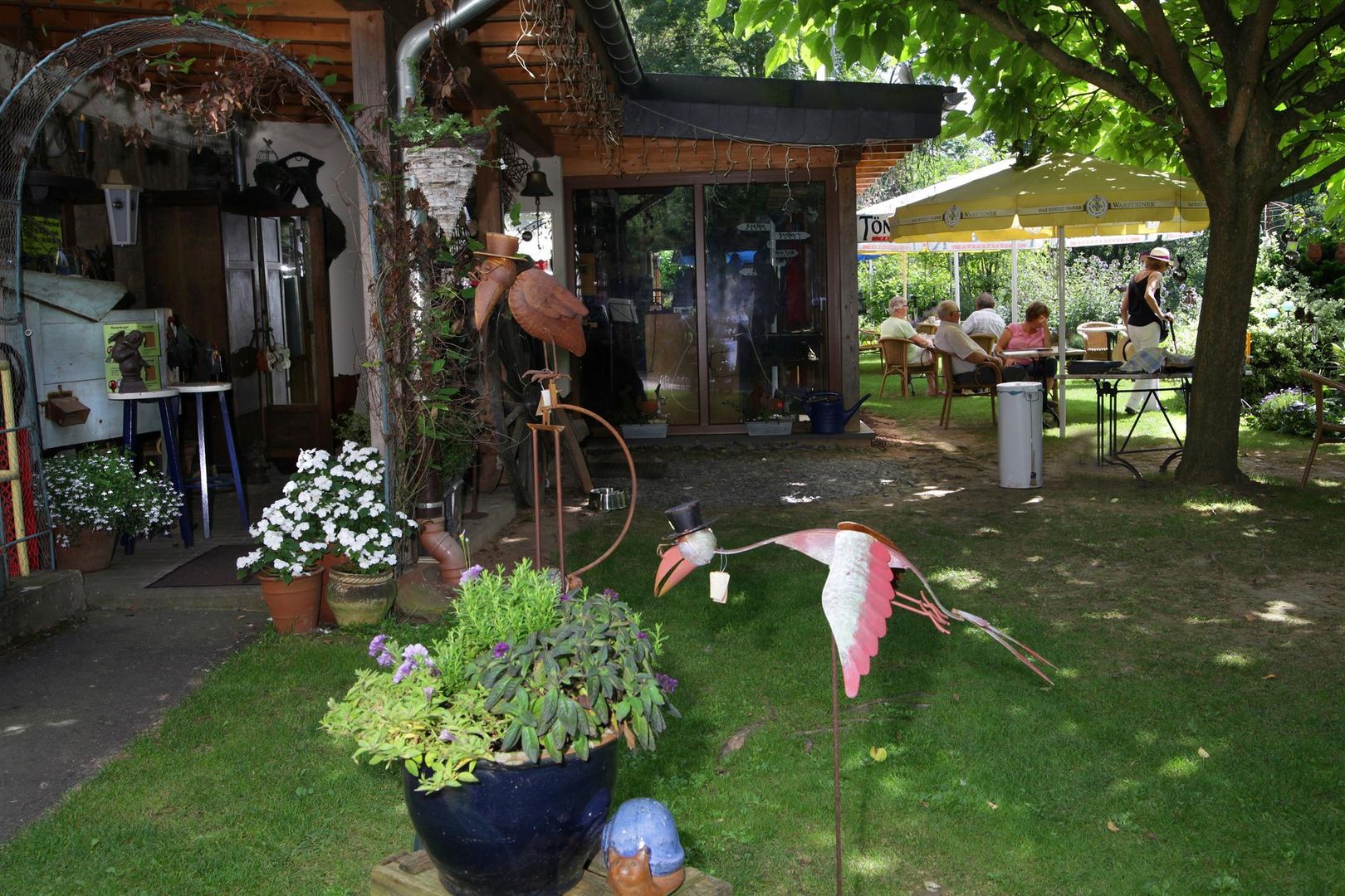 • Een gezellig café in de buitenlucht met meerdere tafels en stoelen onder een grote boom. Gasten genieten van de ontspannen sfeer in een groene tuin.