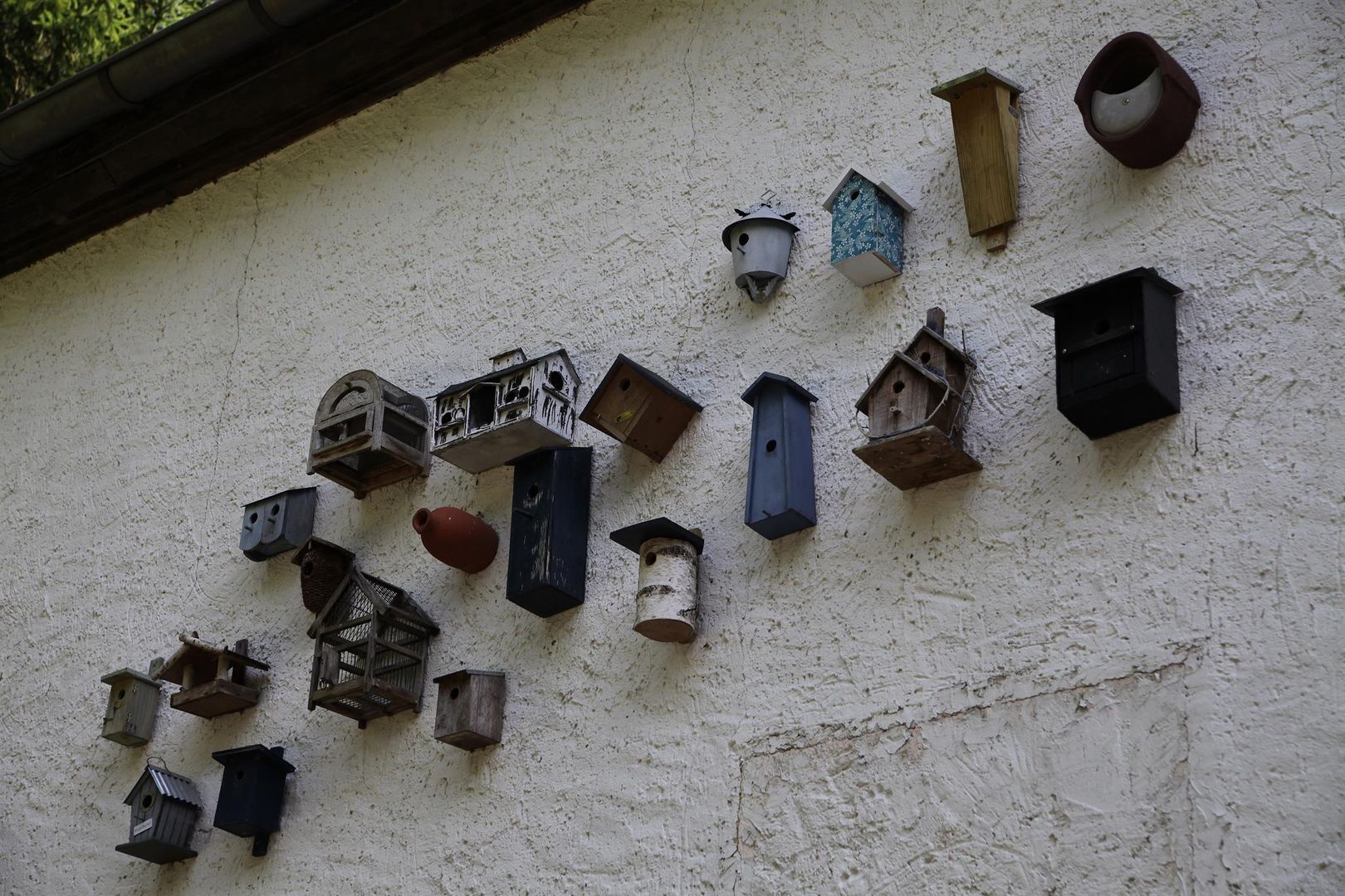 • Een wand met verschillende vogelhuisjes in verschillende kleuren en vormen. De huisjes zijn creatief gerangschikt en geven de ruimte een rustieke charme.