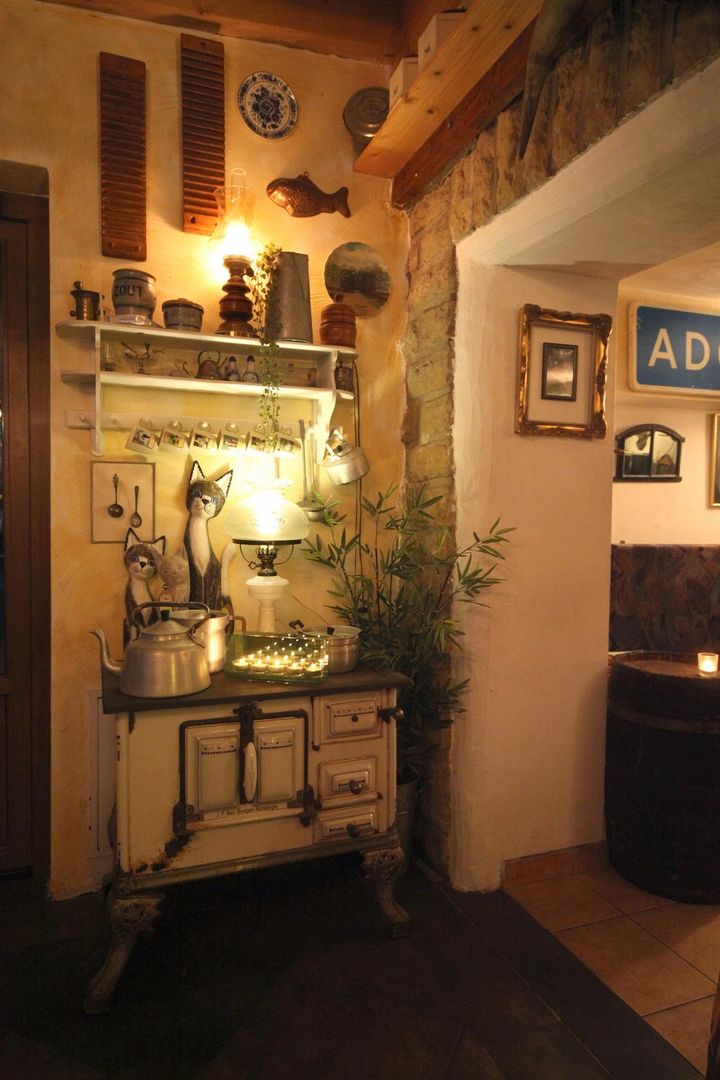 • Een gezellige binnenaanzicht met een rustieke kast en decoratieve voorwerpen. Het warme licht creëert een uitnodigende sfeer.