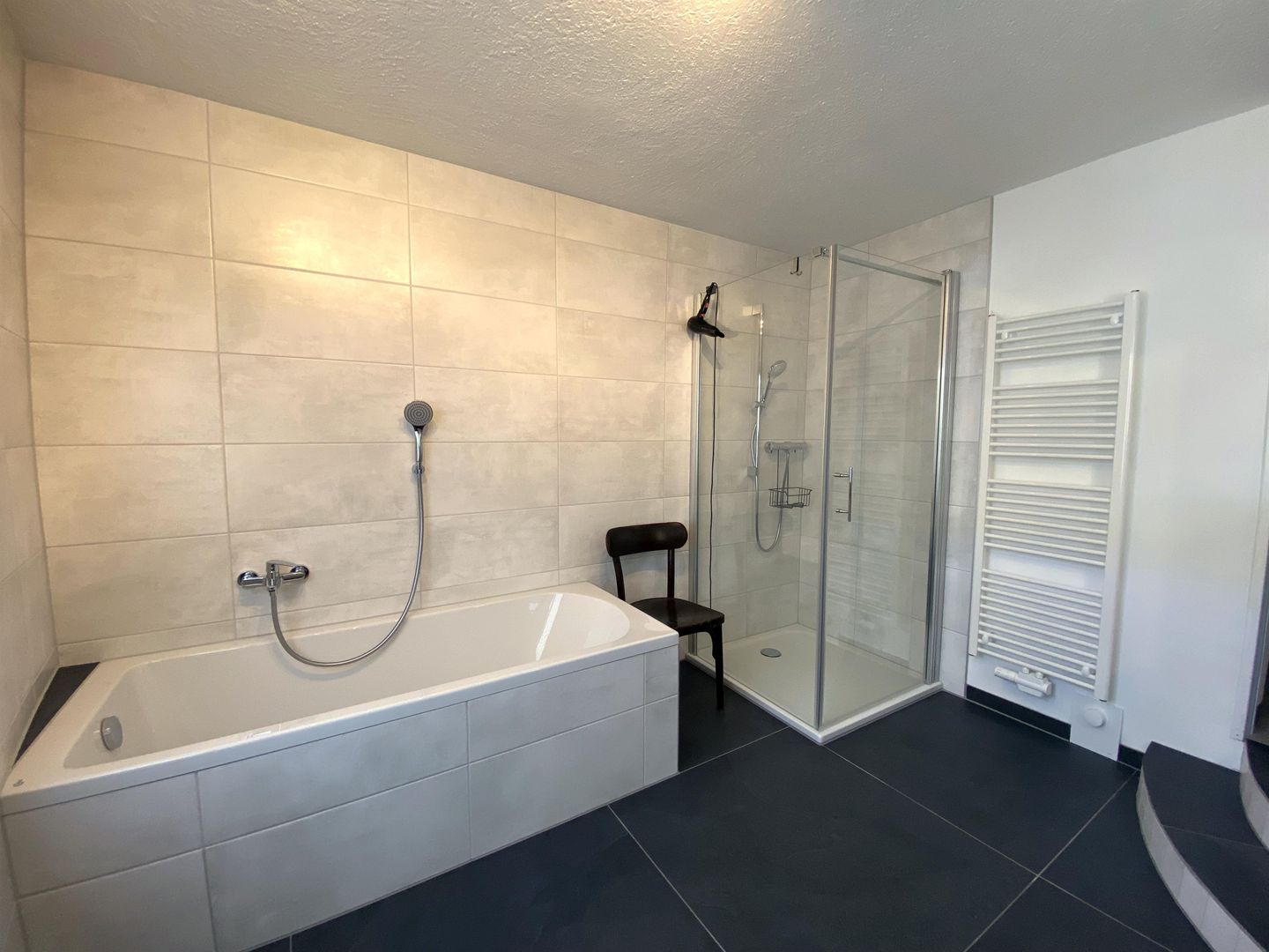 Er is een badkamer met douche en wc op de bovenverdieping en een badkamer met bad, douche en wc op de begane grond.