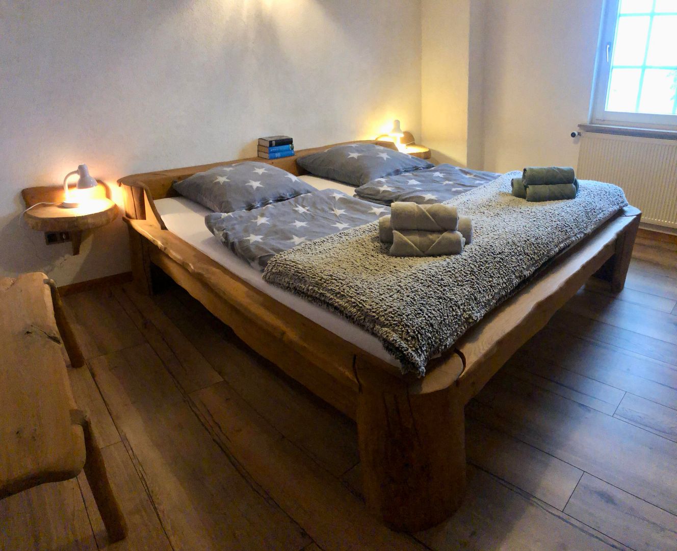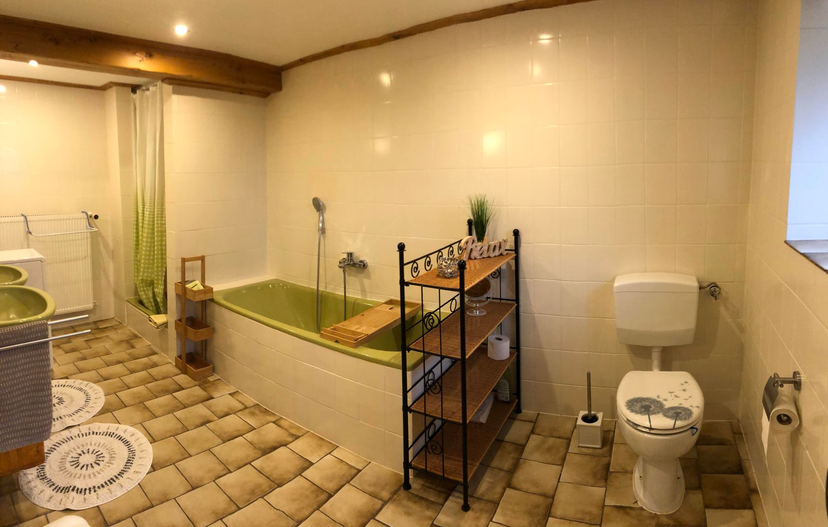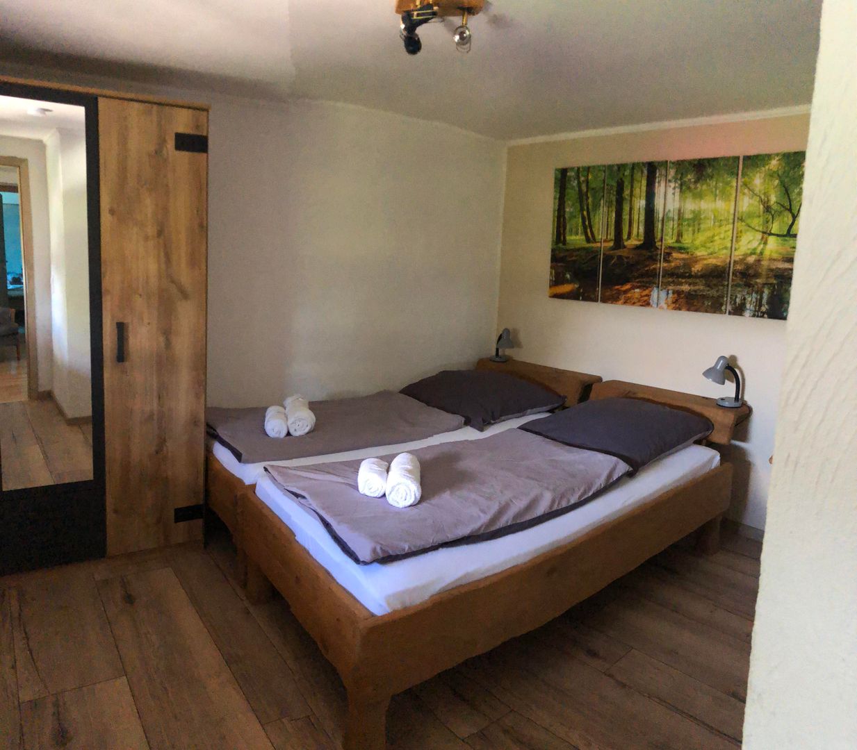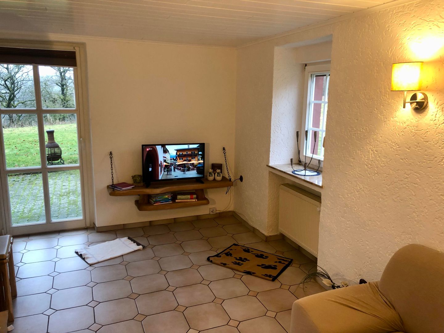 Drie aparte slaapkamers, een extra bed mogelijk, aparte keuken, woonkamer met uitgang naar het terras met een grote omheinde weide, 2 badkamers