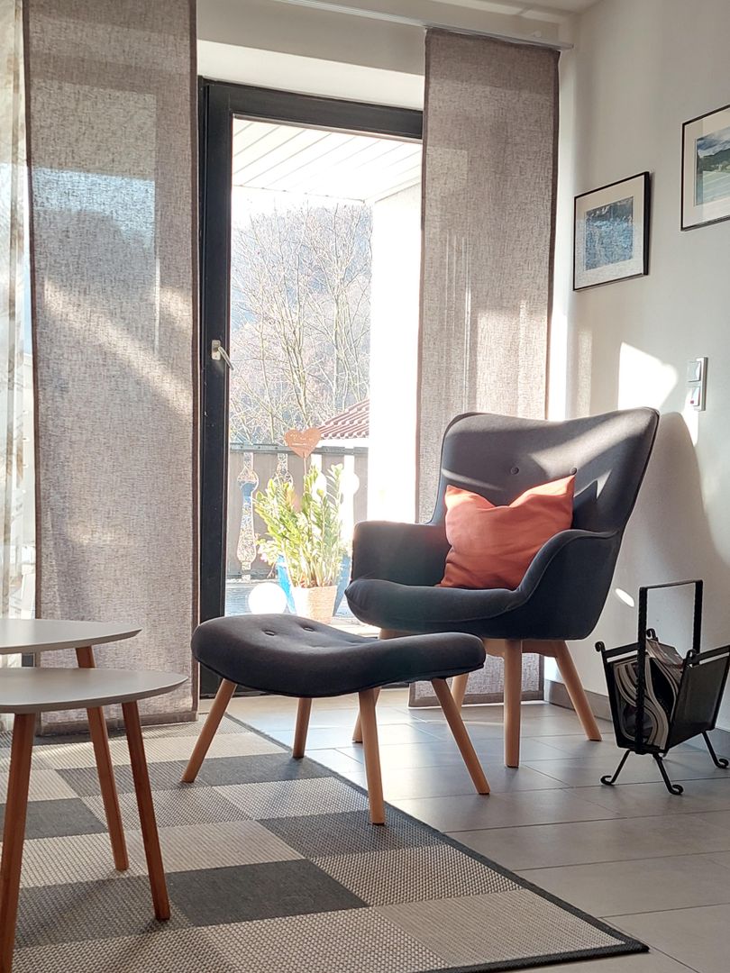 Wij bieden u een weldadige sfeer op 80 m² woonoppervlak met een ecologisch binnenklimaat dankzij natuurlijke leemstuc en wandverwarming. Zowel de woonkamer als de slaapkamer leiden naar het ruime zonneterras (30 m²) waar het heerlijk vertoeven is