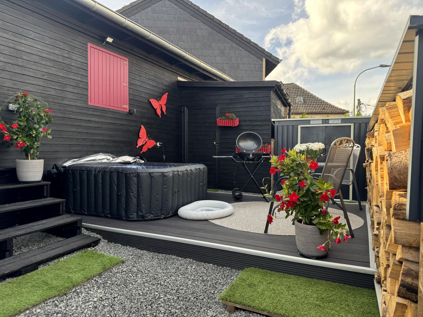 Een bijzonder hoogtepunt is het privéterras, waar een hot tub beschikbaar is op aanvraag van april tot oktober. De flat heeft ook een eigen parkeerplaats.