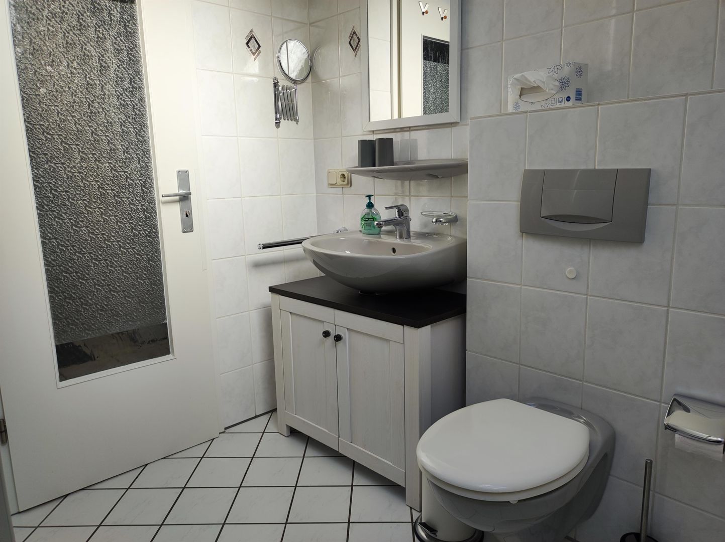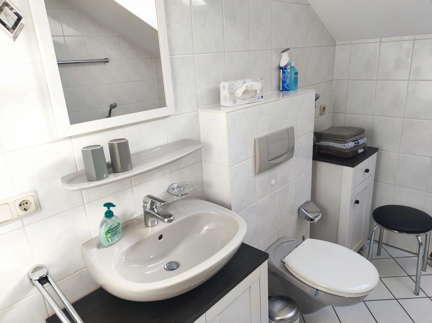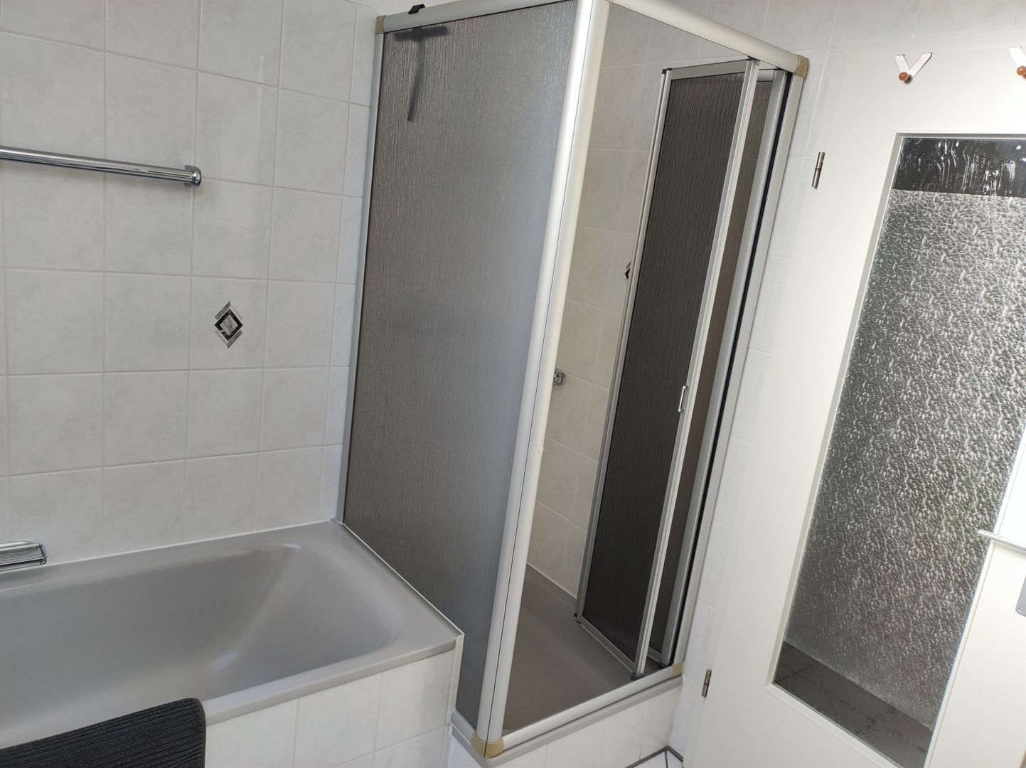 De kleine, maar mooie badkamer heeft een toilet, bad en douche.