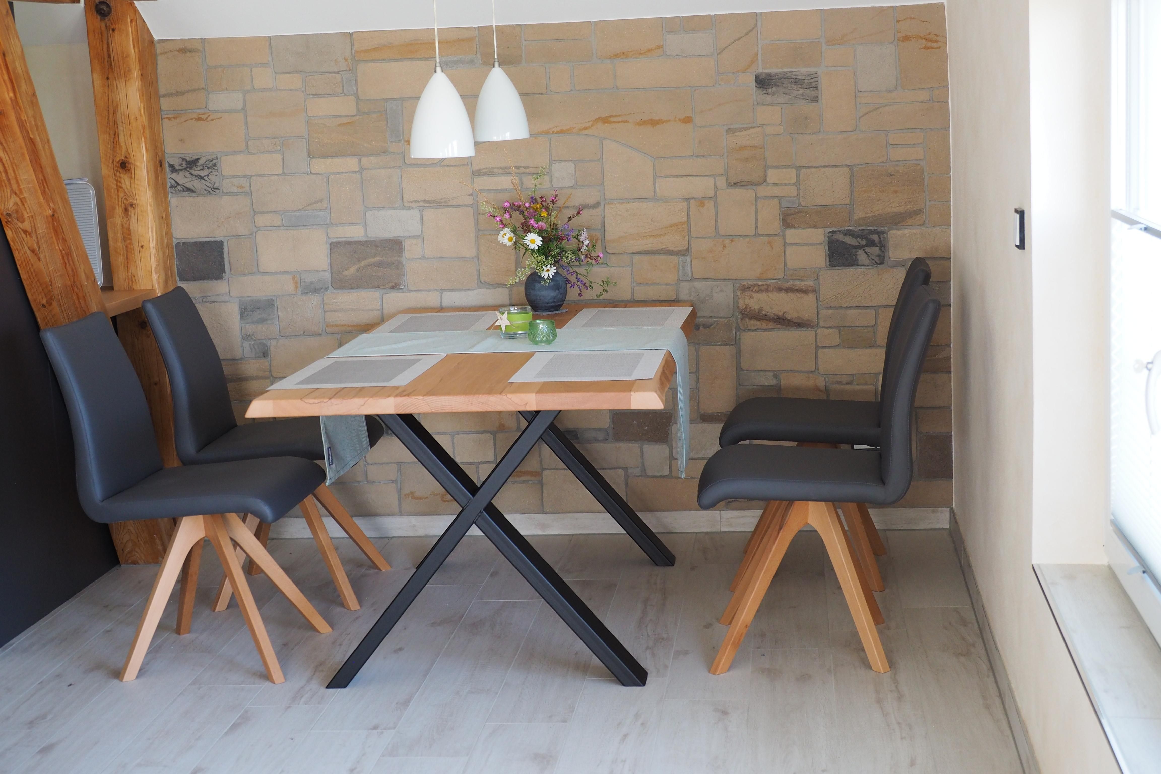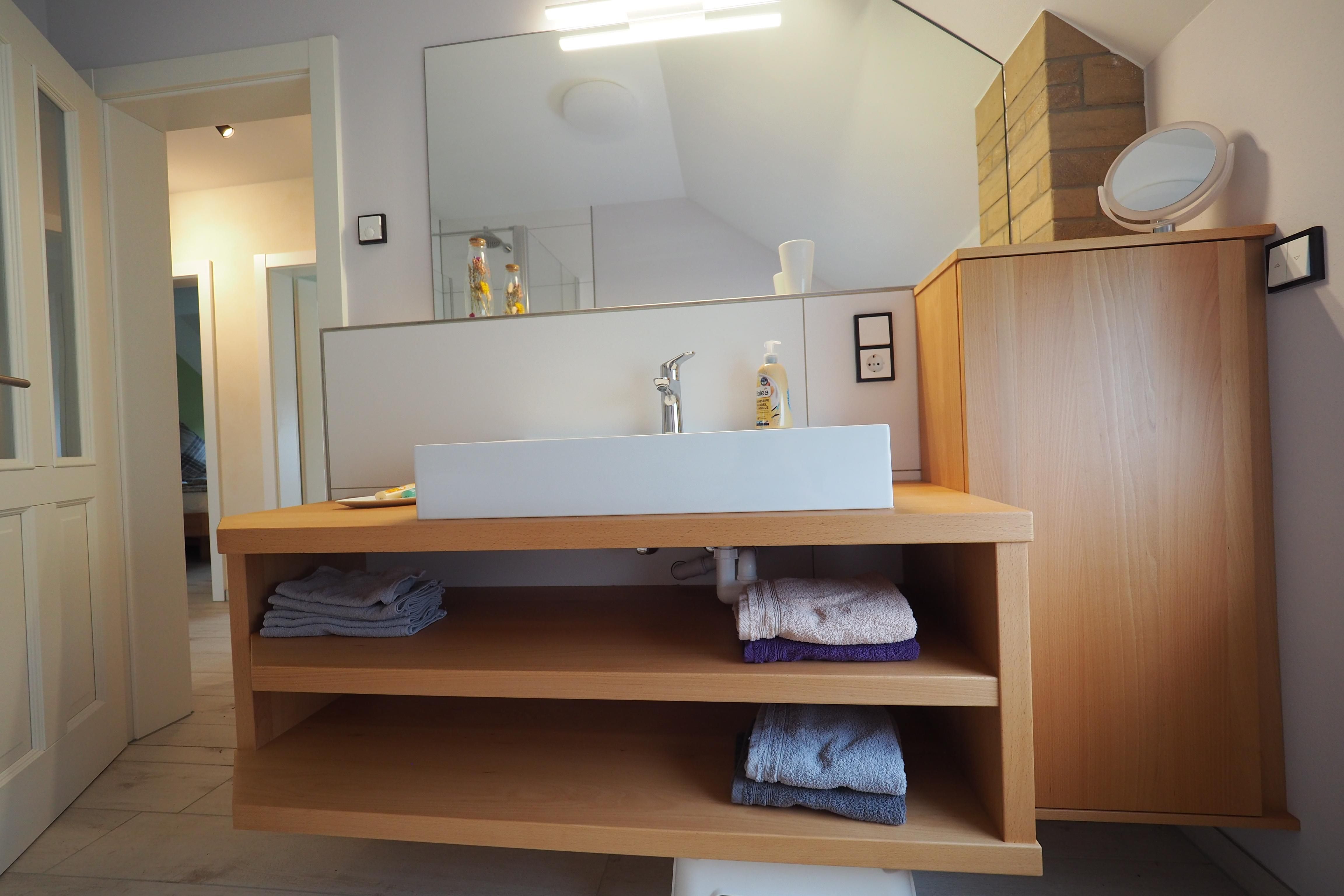Bij de verbouwing van de voormalige koeienstal en hooizolder in 2020 / 21 is de grote ruimte op de 1e verdieping grotendeels bewaard gebleven, net als de oude dakstijlen. Een gemakkelijk toegankelijke trap leidt naar de garderobe en vandaar naar de leeshoek met ontspannende fauteuil en de woonkamer met een fascinerend uitzicht over het landschap en 's nachts naar de sterrenhemel. De volledig uitgeruste moderne keuken zal je hart sneller doen kloppen - je zult nauwelijks iets missen dat nodig is om een goede maaltijd te bereiden. Je kunt dan van je maaltijd genieten aan de beukenhouten tafel op comfortabele stoelen.