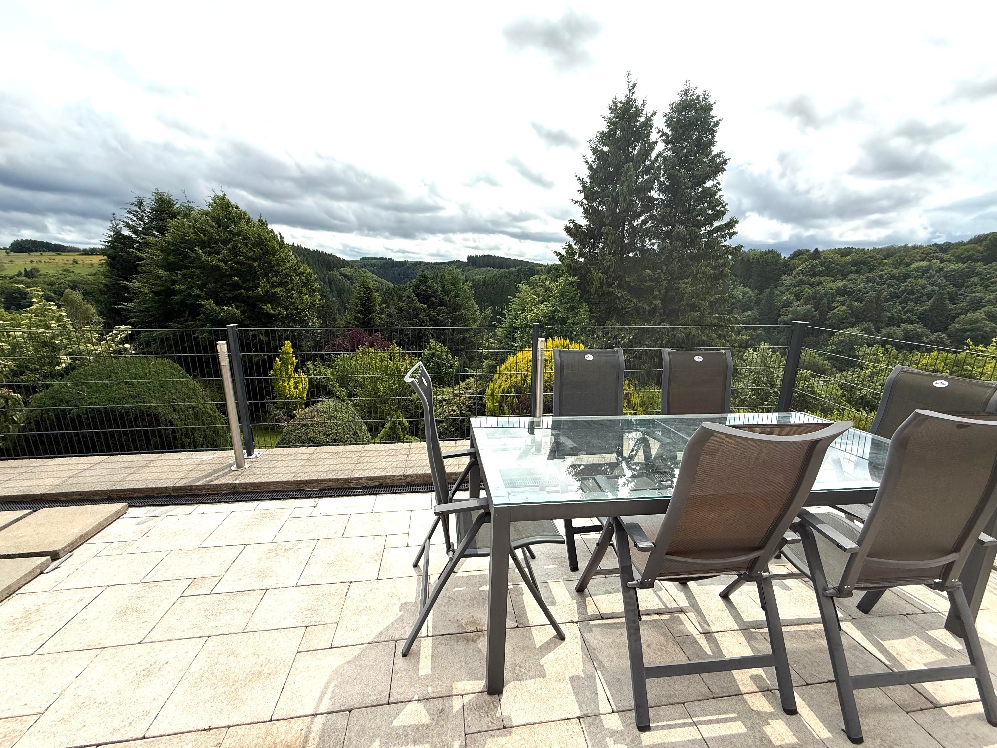 Het terras is direct toegankelijk via de voordeur en heeft een grote parasol en een glazen tafel met 6 zitplaatsen. Vanaf hier heb je toegang tot de tuin, die tegen een helling ligt. Het terras is de perfecte plek voor gezellige zomeravonden!
