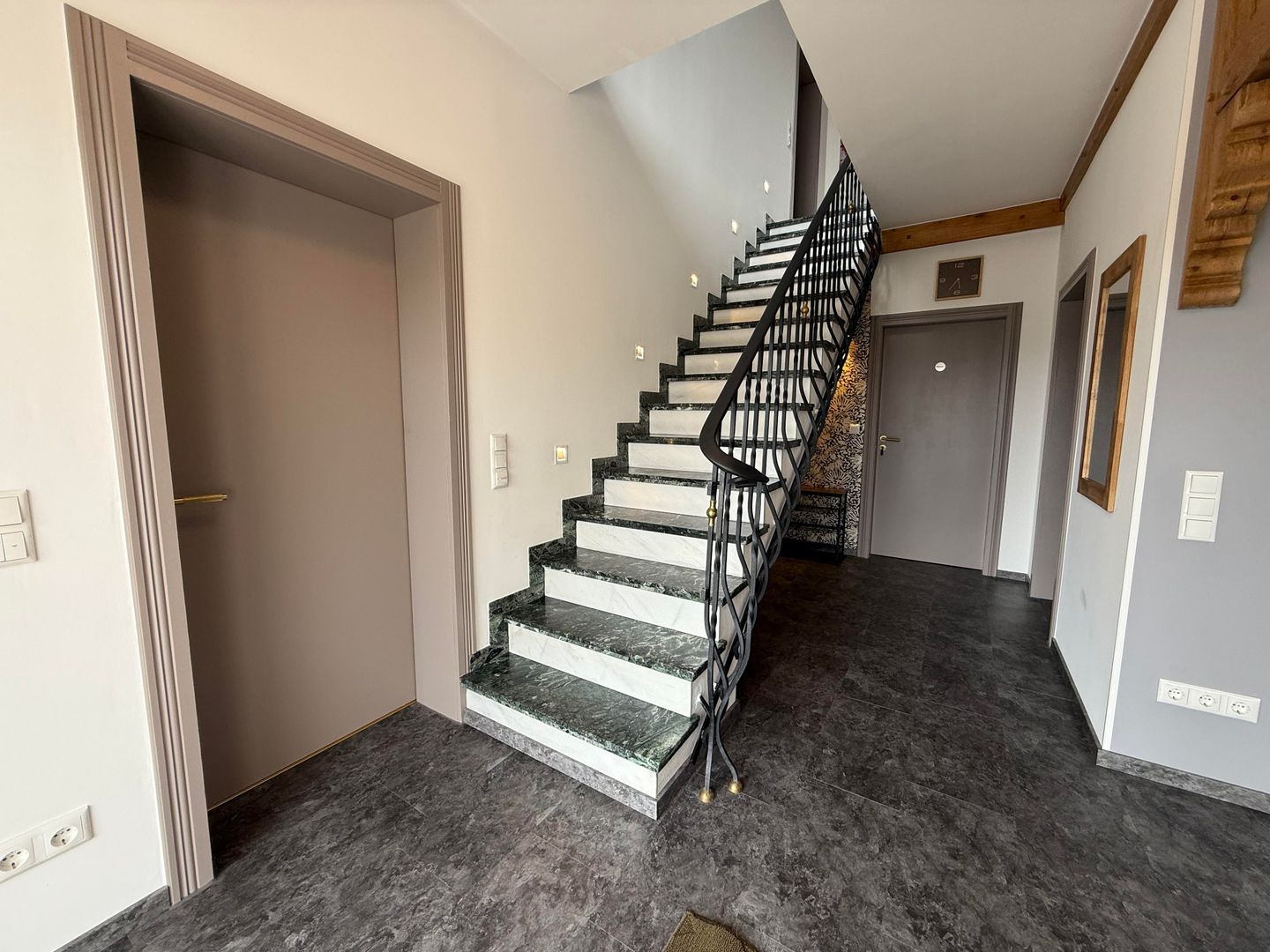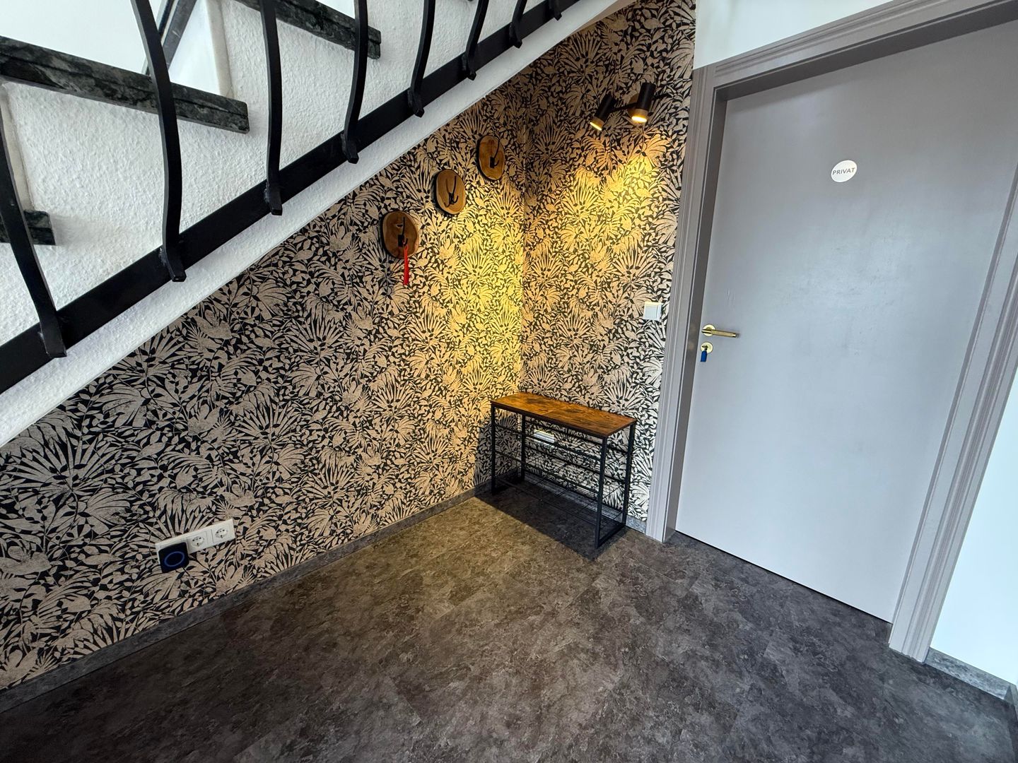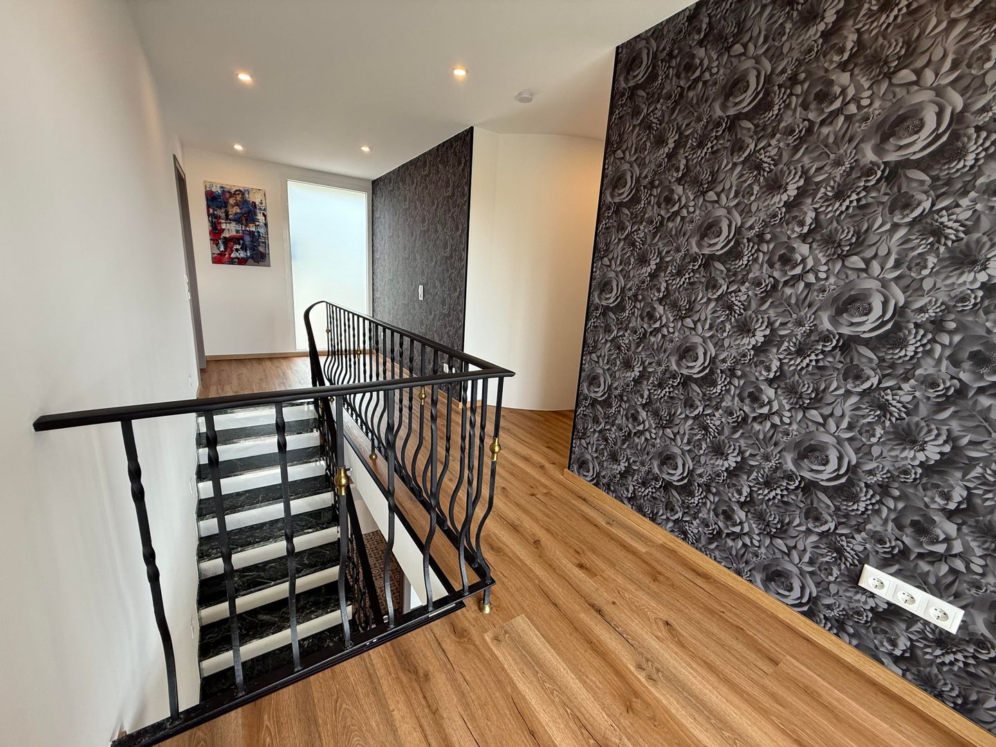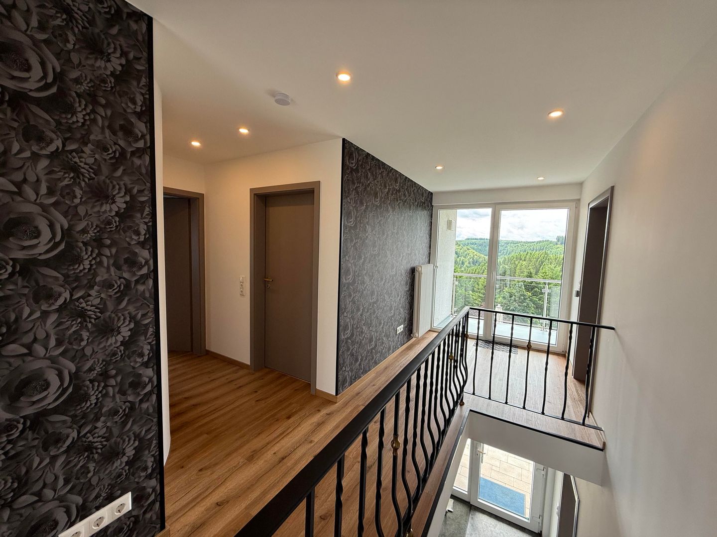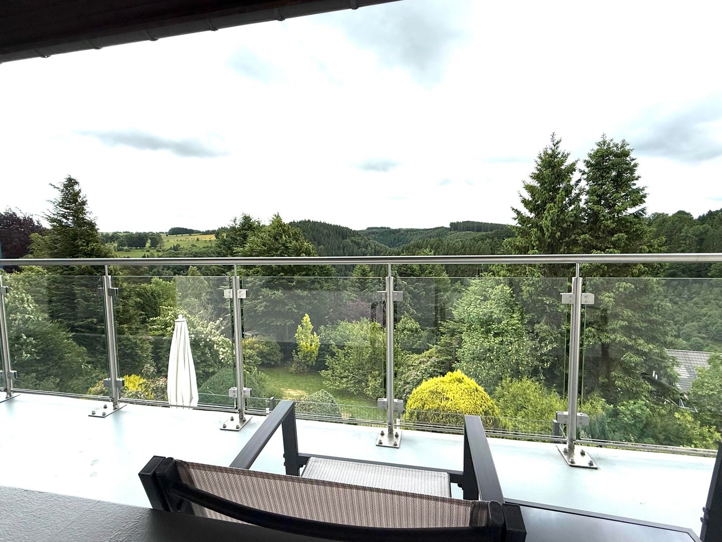 Vanuit de bovenste hal heb je toegang tot het ruime balkon, dat is ingericht met een kleine tafel en twee zitplaatsen. Hier kun je genieten van de frisse lucht en het uitzicht.
