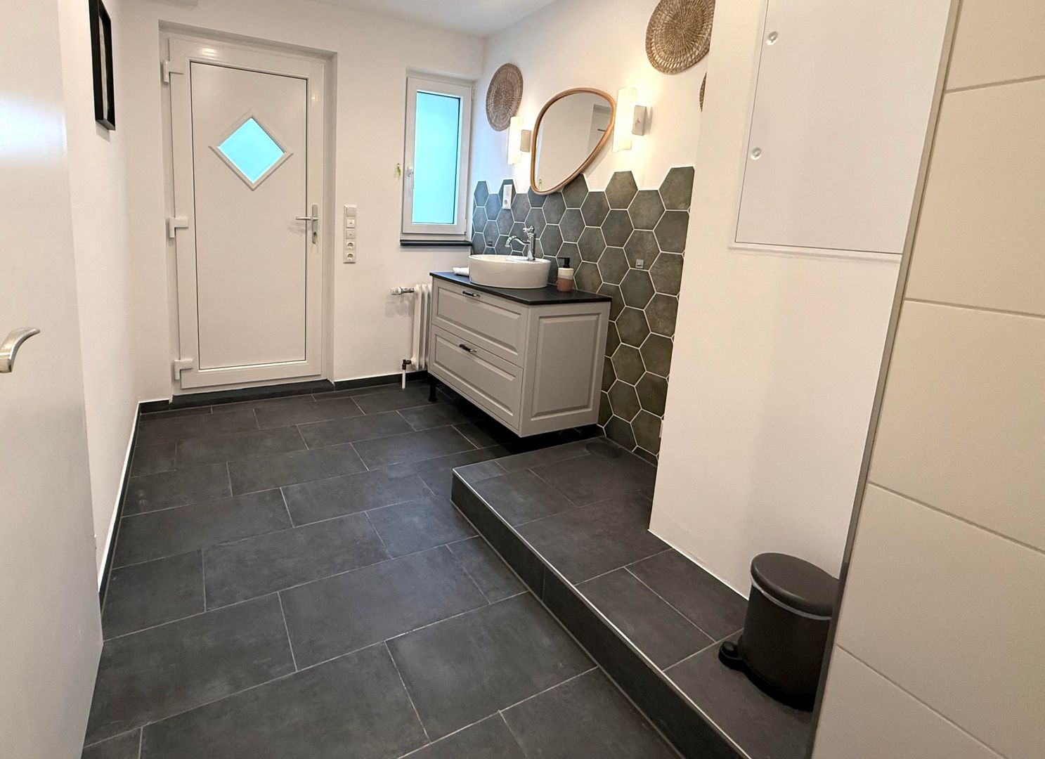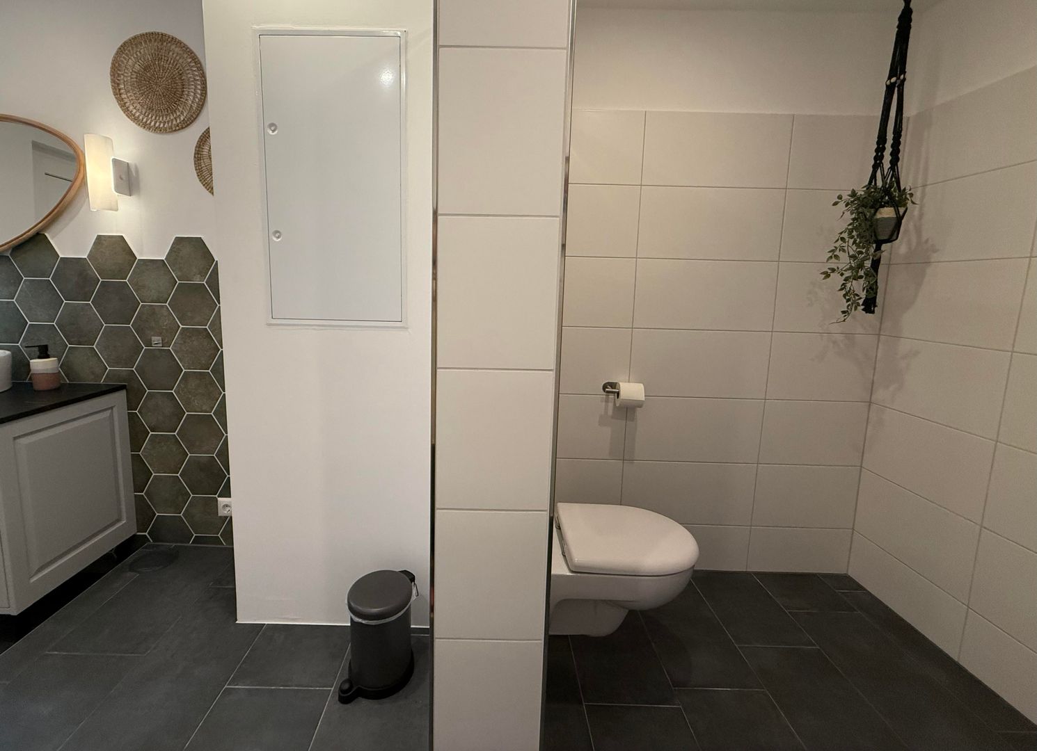 De badkamer op de bovenverdieping heeft een ruime douche, een bad en een ingebouwde kledingkast. Er is ook een haardroger beschikbaar. Er is ook een wasruimte op de begane grond met een ruime wastafel en toilet.