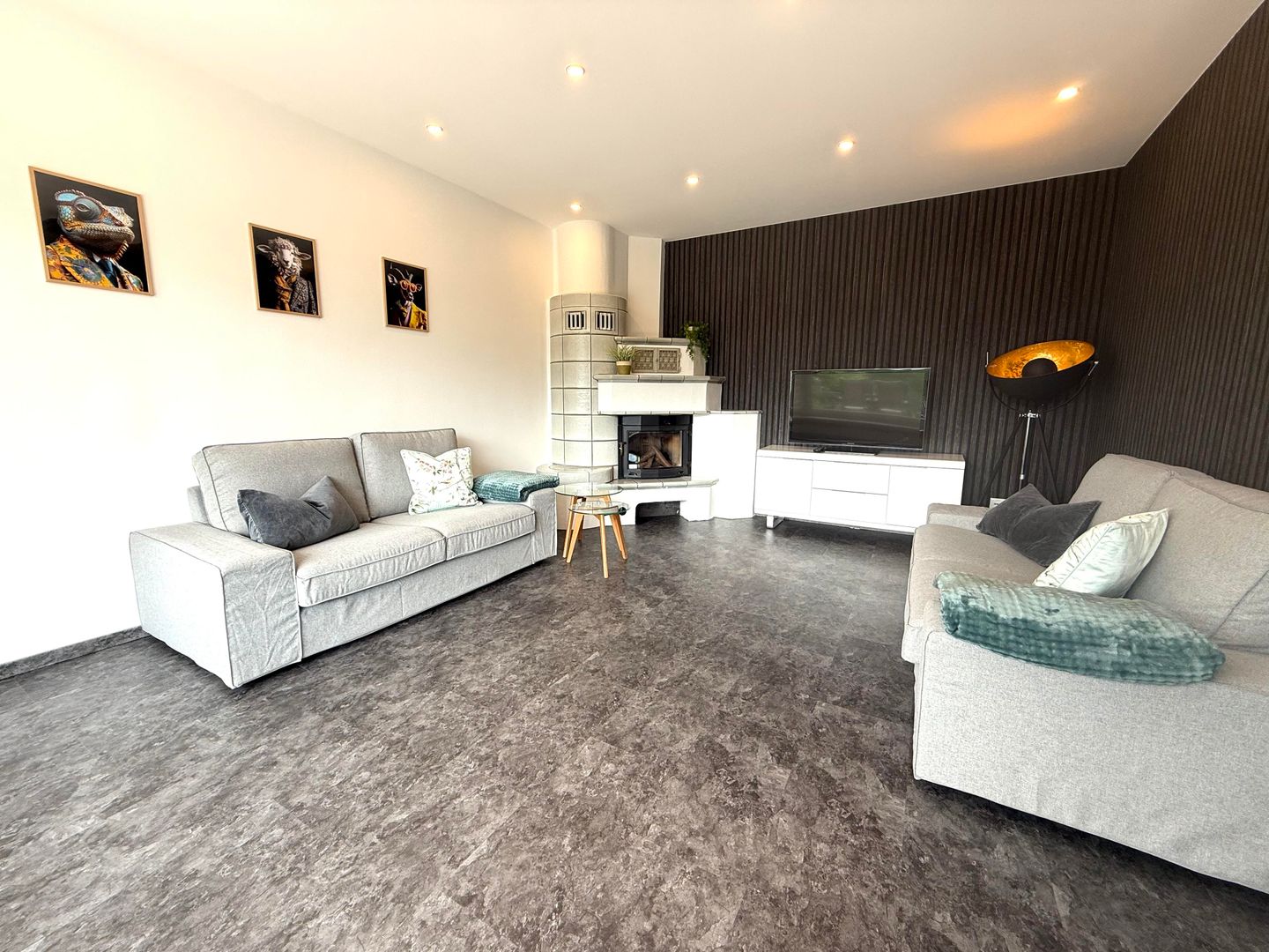 De gezellige woonkamer is ingericht met twee banken, een flatscreentelevisie en een decoratieve tegelkachel. Hier kun je ontspannen avonden doorbrengen en genieten van het uitzicht op het groen.