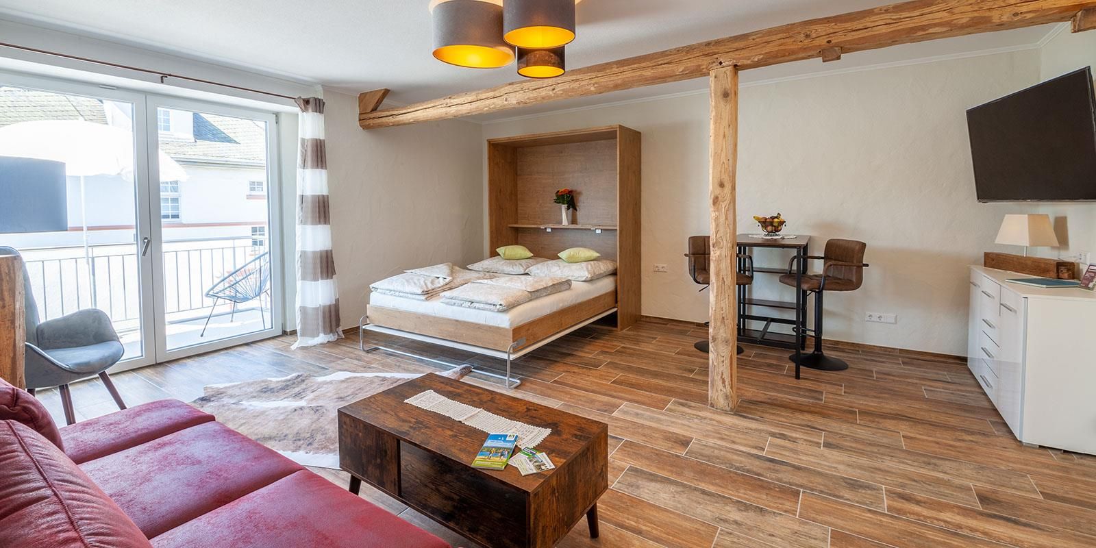Drie ruime appartementen in moderne landhuisstijl met een royaal uitzicht op de Schalkenmehren Maar.