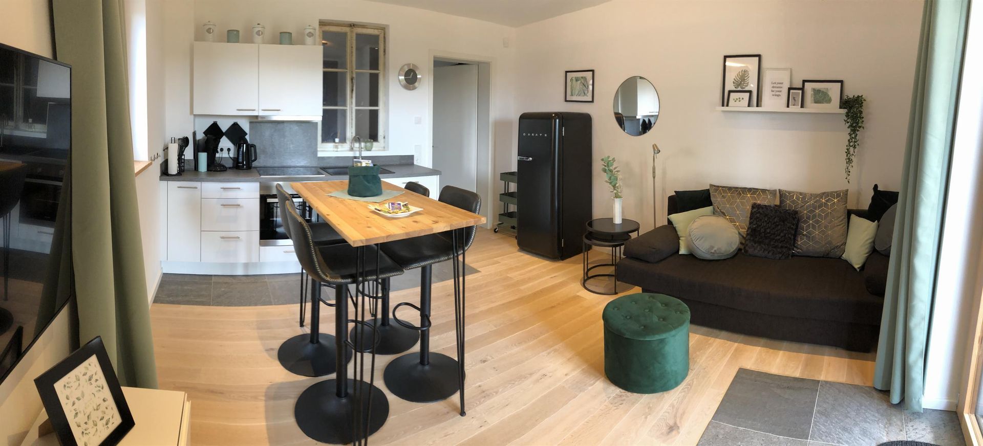De woonkamer is ingericht met een gezellige bank en een grote flatscreen-tv. De open keuken in de woonkamer is zeer goed uitgerust en volledig ingericht met vaatwasser, fornuis met oven en keramische kookplaat, koffiezetapparaat (pad), waterkoker, eethoek met comfortabele barkrukken, retro koelkast met apart vriesvak.