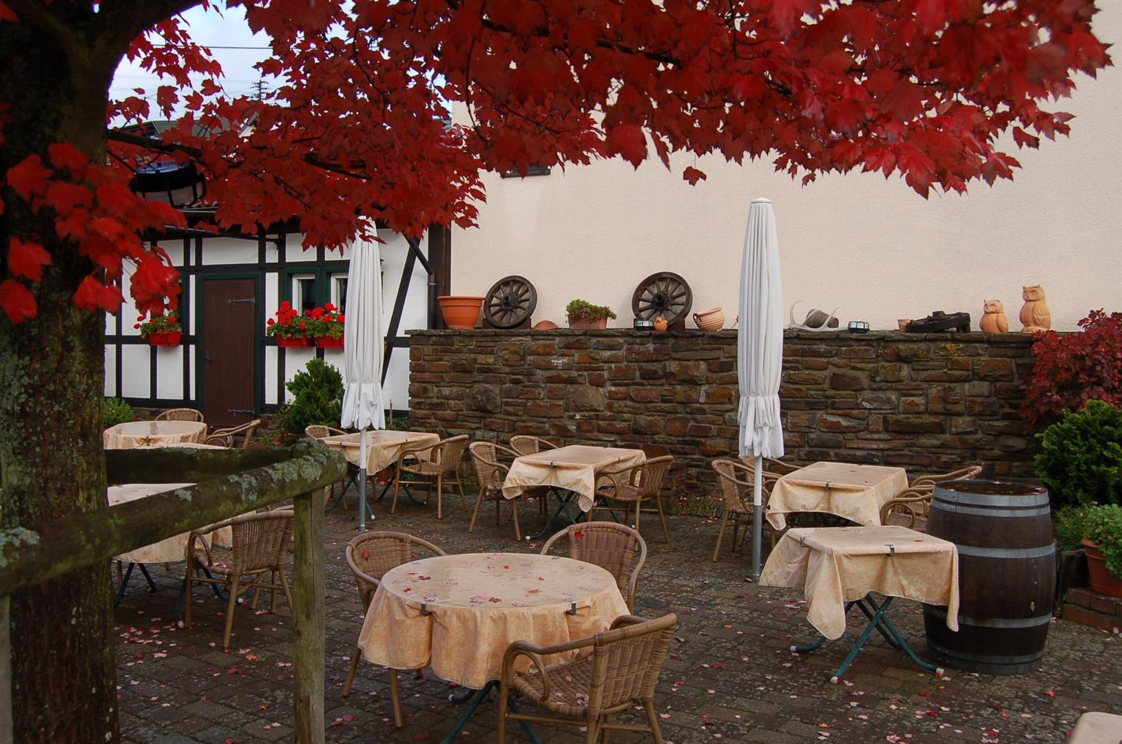 In de zomer kunnen gasten in de biertuin genieten van een maaltijd en wijn uit de regio Ahr.
