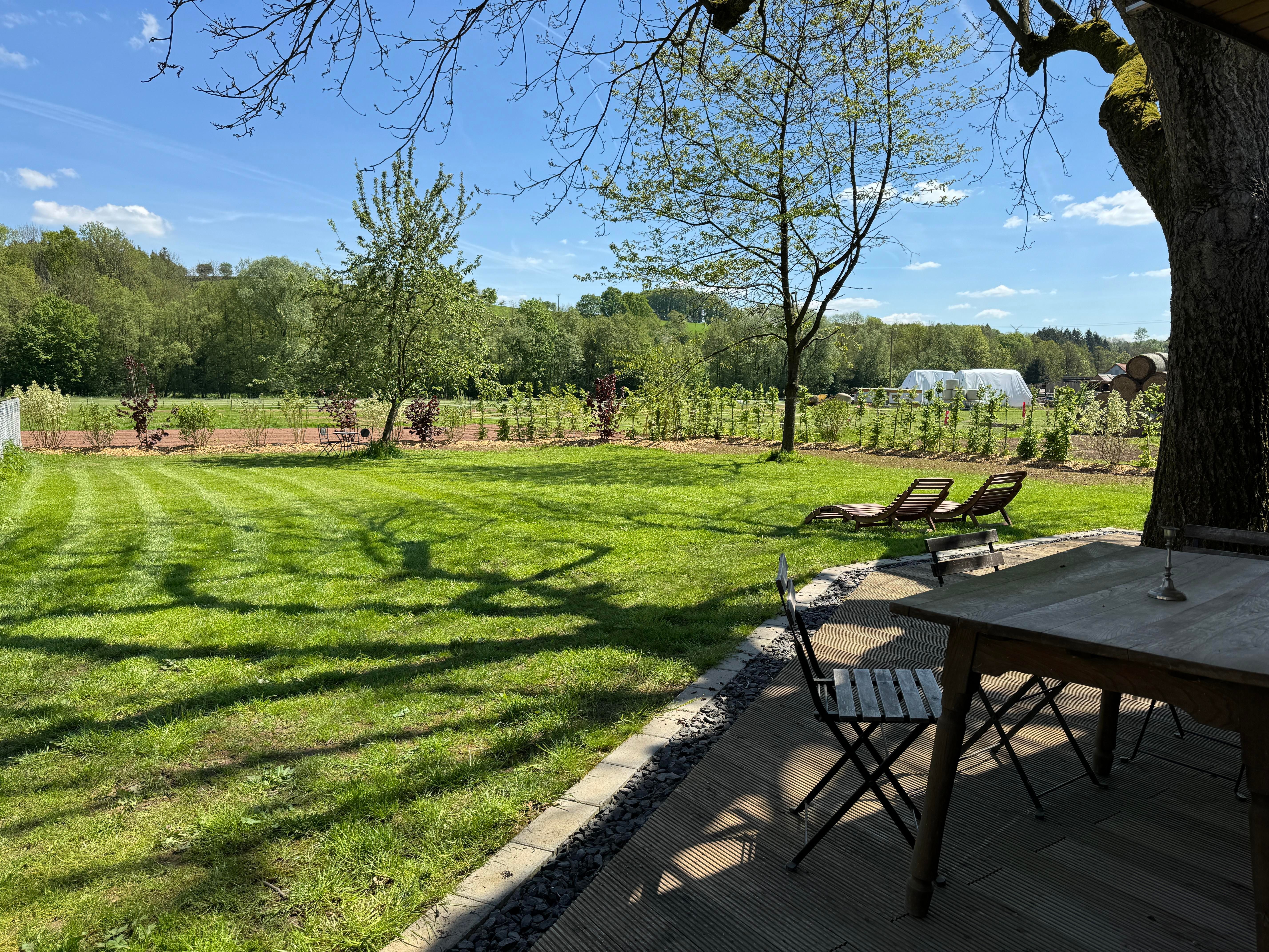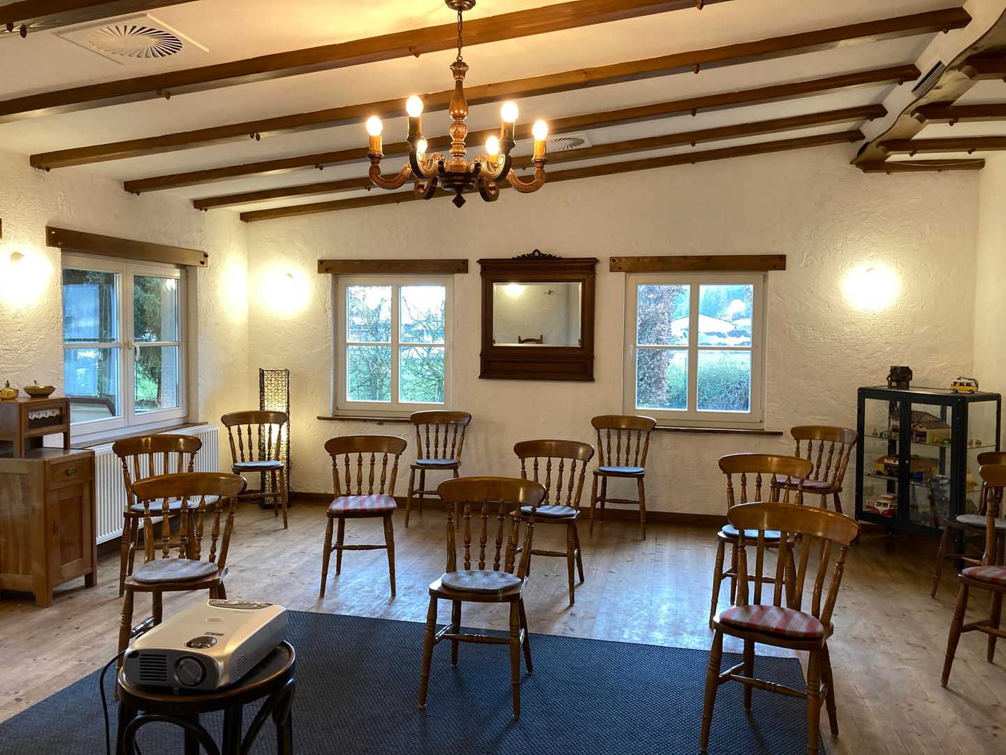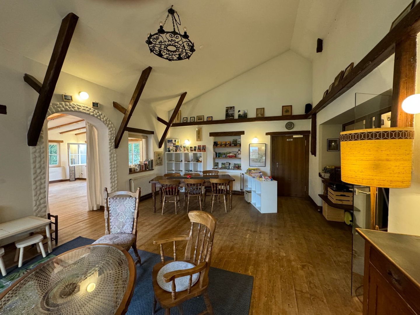 Onze seminarruimte kan gehuurd worden voor cursussen, workshops en evenementen. De lichte ruimte heeft een uitgang naar de veranda in onze achtertuin. Je kijkt uit op onze oude walnotenboom, ons varken Jacky en de kippen - er is niets dat meer afleiding biedt dan dat. Ons minivarken, Erna de kat en de kippen kijken uit naar een bezoekje.