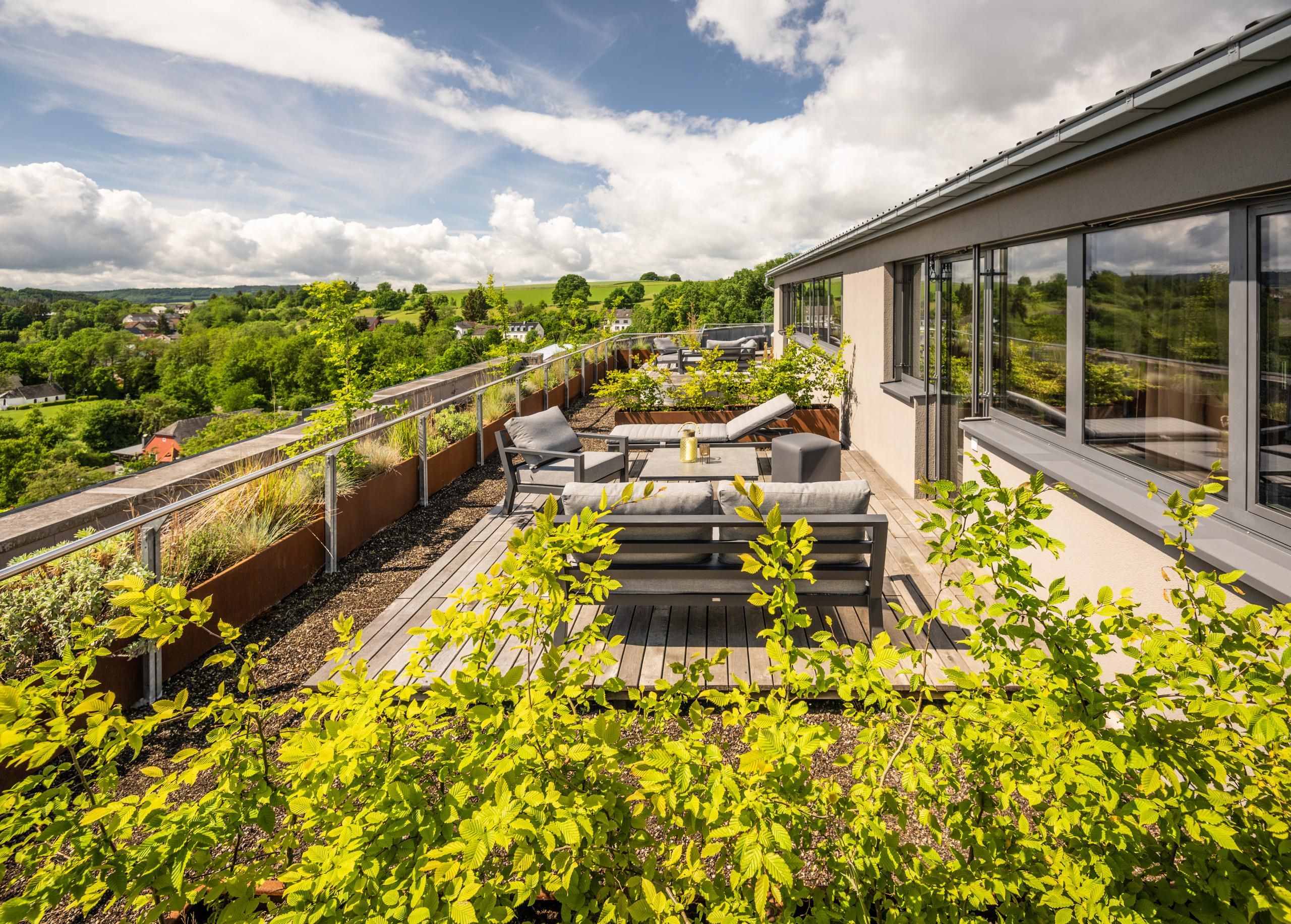 De moderne en transparante architectuur van het Genusswerk biedt een prachtig panoramisch uitzicht op het weidse, groene heuvellandschap van het natuurpark Zuid-Eifel. Alle tien suites zijn individueel ingericht volgens een zeer hoge standaard. Sommige hebben zelfs een eigen whirlpool. Het zonnige terras van het Genusswerk is de ideale plek om te ontspannen en ongestoord te genieten van de idyllische omgeving.