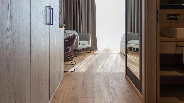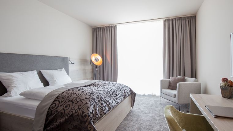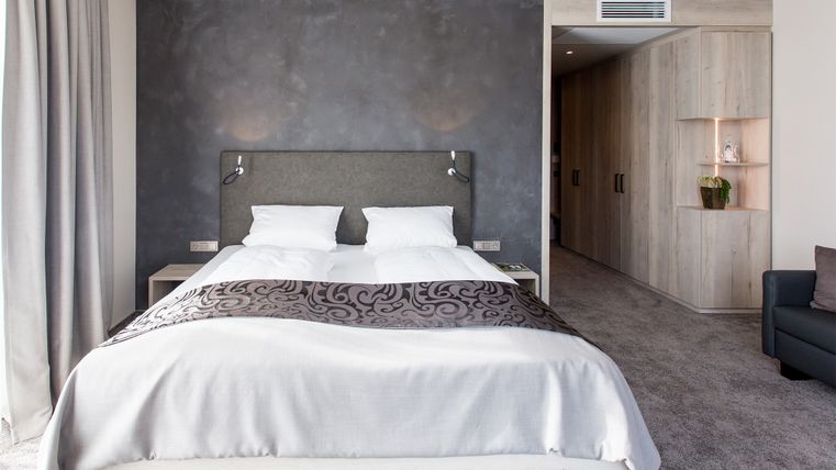12 tweepersoonskamers superior ca. 30 m² woonoppervlak, bed 180 x 200, kledingkast met kleerhangers, bagagerek, kluis, flatscreen-tv, telefoon, WLAN, bureau met stoel, aparte wc, grote douche, haardroger, make-upspiegel
