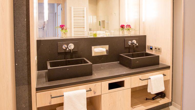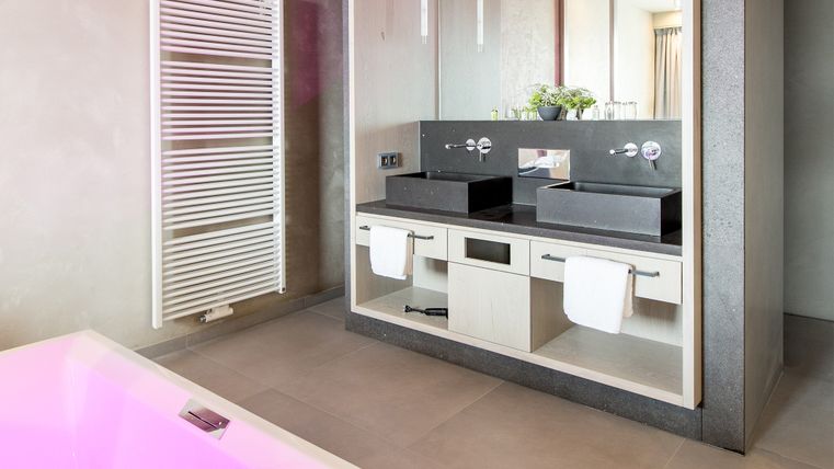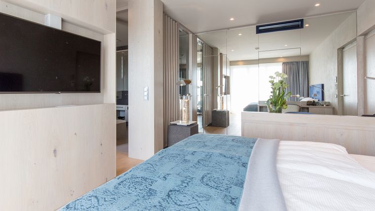 Suite "Waterca. 50 m² woonoppervlakte, belevingsdouche, ligbad met LED-verlichting, balkonterras, bed 200 x 200, kledingkast met kleerhanger, bagagerek, kluis, flatscreen-tv, telefoon, WLAN, bureau met stoel, aparte WC, grote douche, haardroger, make-upspiegel, Qbo-capsuleapparaat, minibar