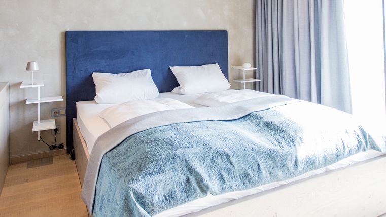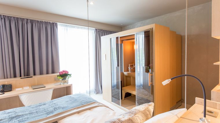 Suite "Air": ca. 50 vierkante meter woonoppervlak, zwevend bed, bed 200 x 200, sauna op de kamer, kledingkast met kleerhanger, bagagerek, kluis, flatscreen-tv, telefoon, WLAN, balkonterras met skywalk, bureau met stoel, aparte wc, ruime douche, haardroger, make-upspiegel, Qbo-capsuleapparaat, minibar
