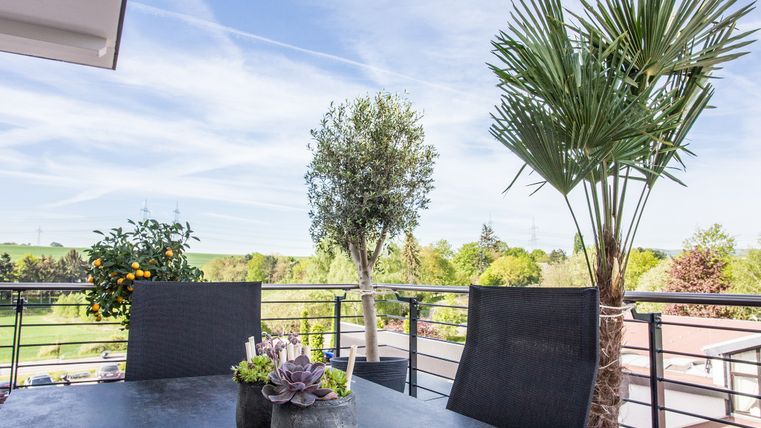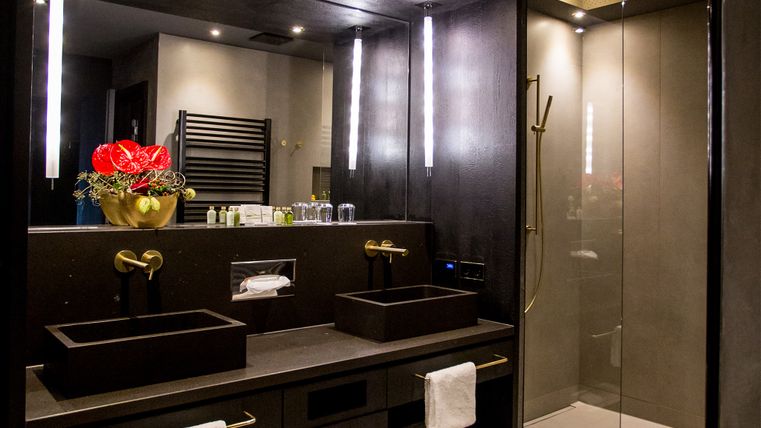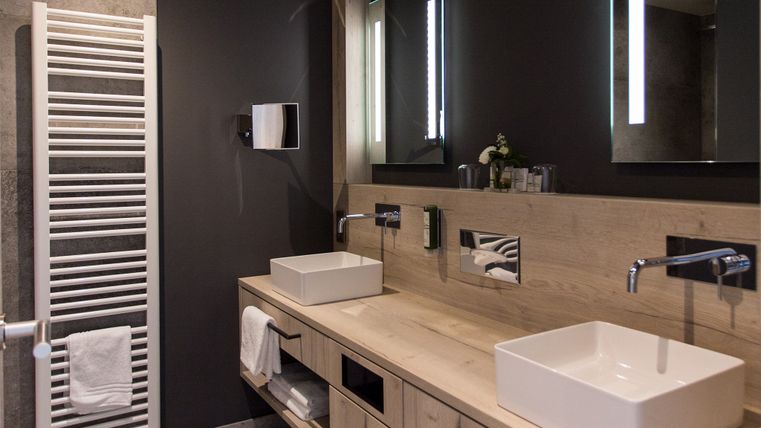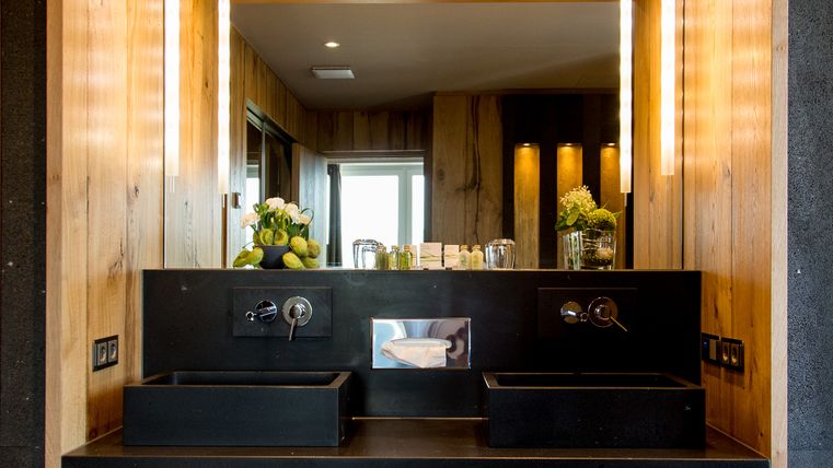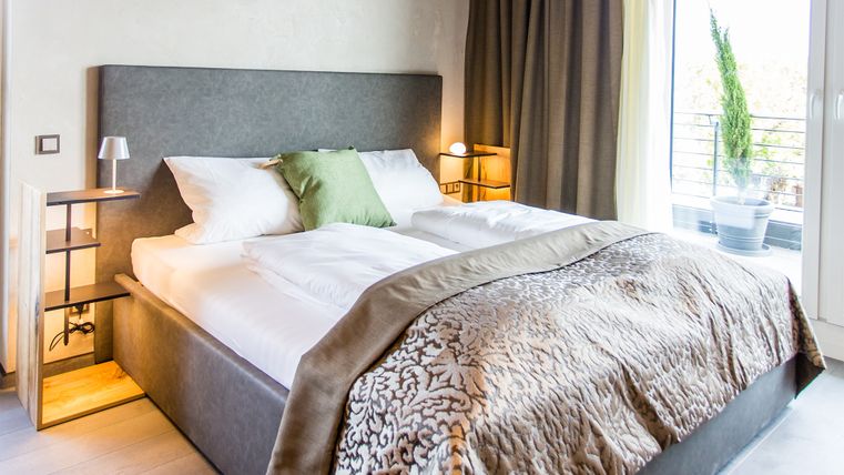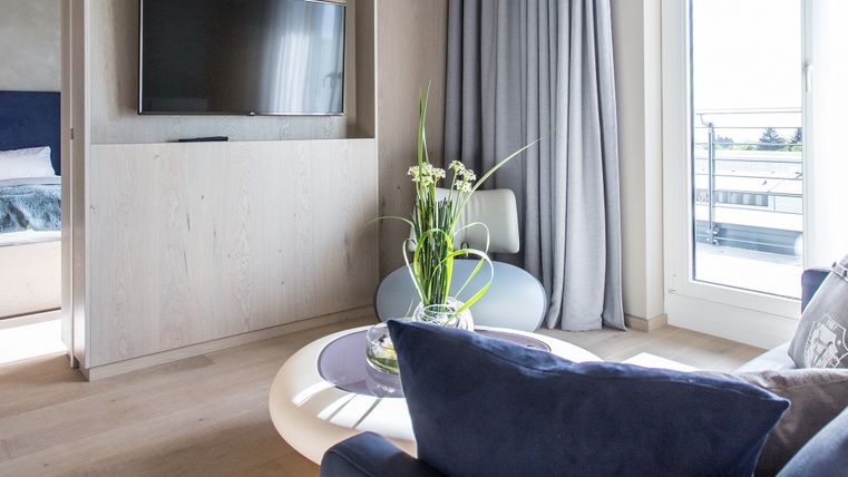 Suite "Aardeca. 50 m² woonoppervlak, groot terras met uitzicht op het Rijndal, bed 200 x 200, stoombad, kledingkast met kleerhanger, bagagerek, kluis, flatscreen-tv, telefoon, WLAN, bureau met stoel, aparte wc, ruime douche, haardroger, make-upspiegel, Qbo-capsuleapparaat, minibar