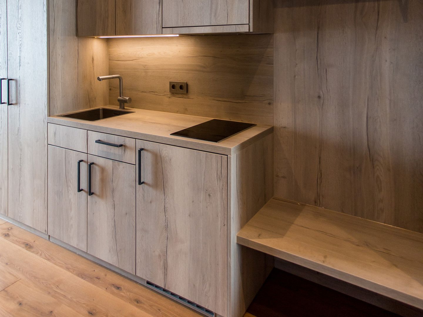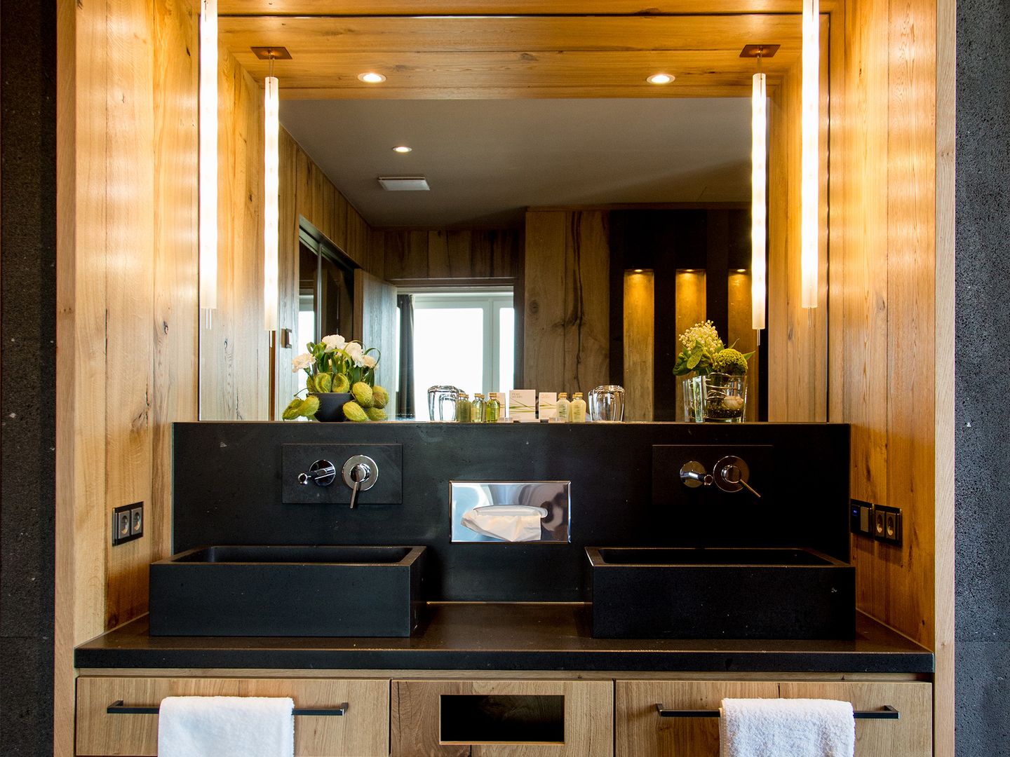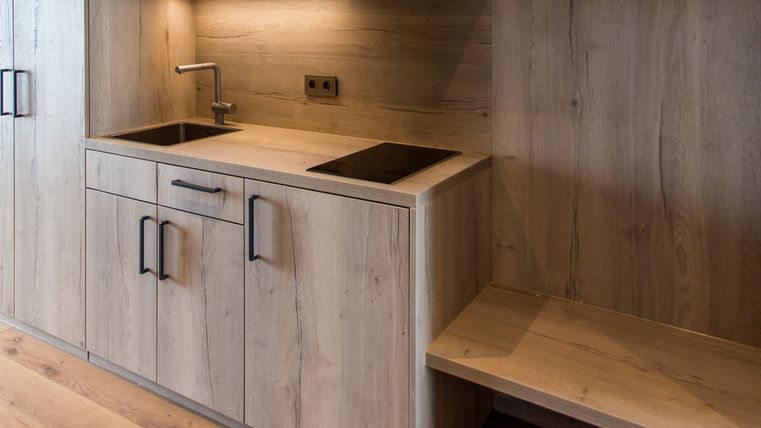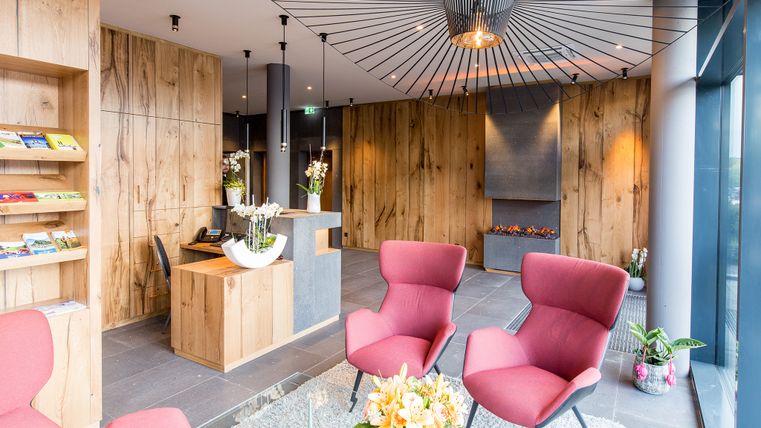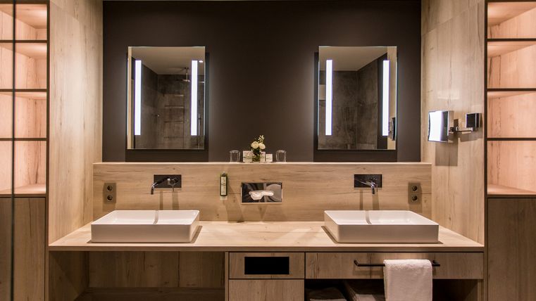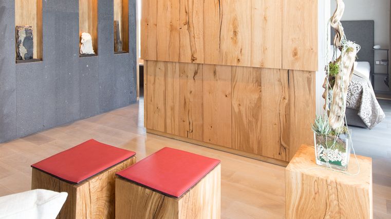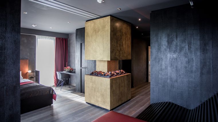 Suite "Fire":ca. 50 m² woonruimte, open haard, infrarood ligstoel, exclusief ontworpen met gezwart hout, balkonterras, 2 aparte kamers, bed 200 x 200, kledingkast met kleerhanger, bagagerek, kluis, flatscreen-tv, telefoon, WLAN, bureau met stoel, apart toilet, ruime douche, haardroger, make-upspiegel, Qbo-capsule-apparaat, minibar