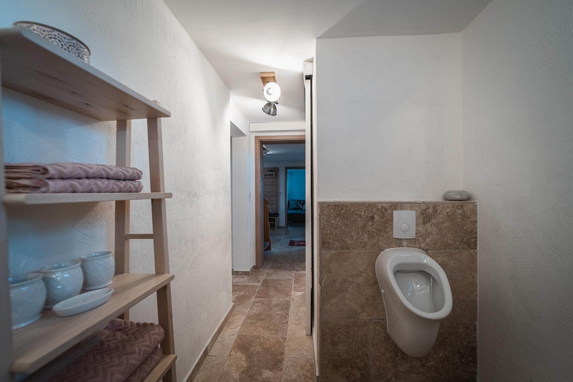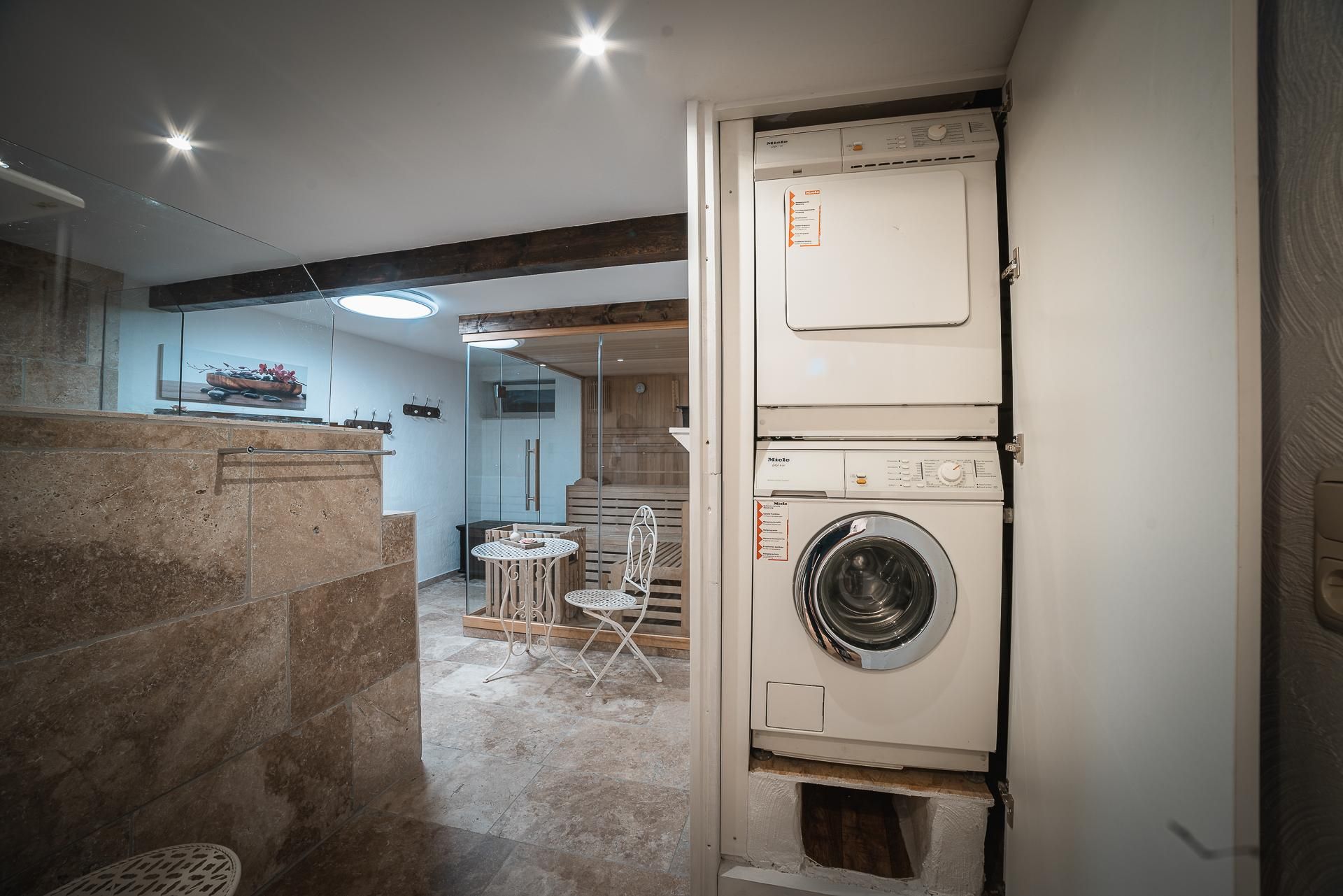 In de eetkamer staat een grote tafel van echt hout met voldoende zitplaatsen, een kinderstoel en een gezellige bank. In de woonkamer staat een hoekbank die kan worden omgebouwd tot een tweepersoonsbed (1,40 x 2,20 meter). De programmeerbare en op afstand bedienbare pelletkachel zorgt voor een gezellige sfeer. Een smart TV (WLAN en CI-slot) is ook beschikbaar. In het "SPA-gedeelte" is er een grote sauna, twee douches, verschillende zitmogelijkheden, twee wastafels, een urinoir en een toilet. Er is ook een haardroger beschikbaar.