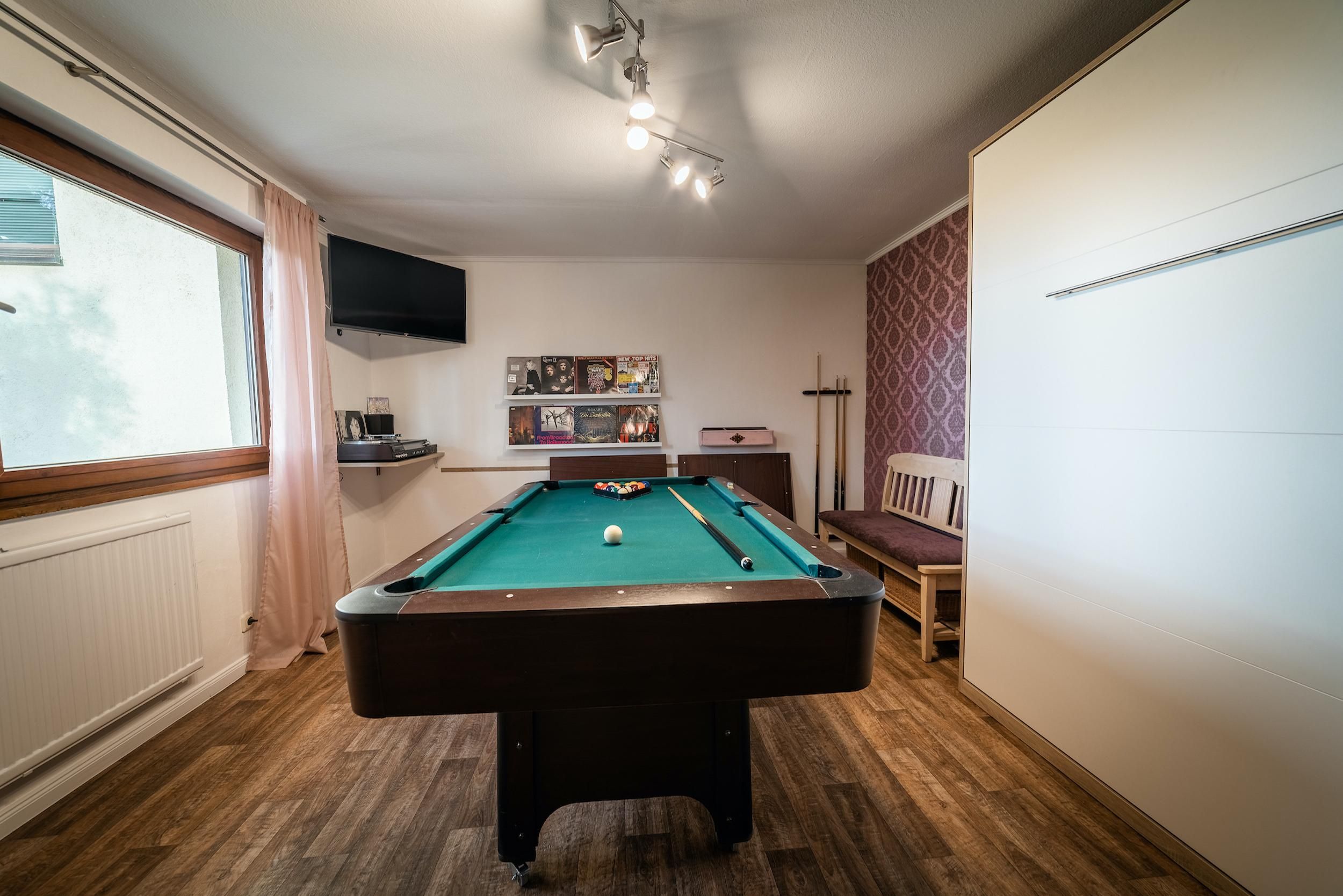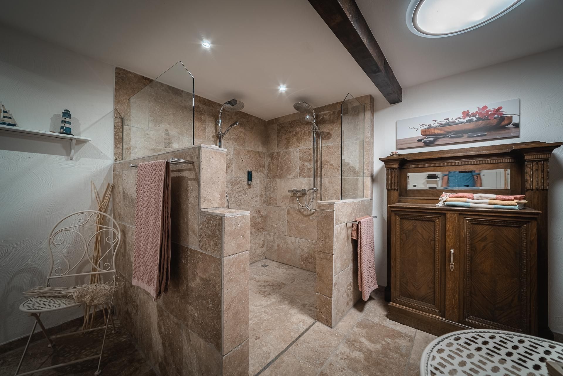 Boven zijn er 4 slaapkamers en een badkamer. De slaapkamers zijn voorzien van tweepersoonsbedden (2 x 1.80 x 2.00m / 2 x 1.60 x 2.00m) en hebben elk een Smart TV. Eén kamer is gecombineerd als slaap- en speelkamer, met een biljarttafel en opklapbed, dat op en neer kan worden geklapt als dat nodig is. Met de slaapmogelijkheid in de woonkamer kunnen tot 10 personen een aangename vakantie doorbrengen in het zomerhuis. Een kinderbedje kan worden verstrekt indien nodig. De badkamer op de bovenverdieping is ook volledig uitgerust met wc, wastafel en douche en natuurlijk een haardroger.