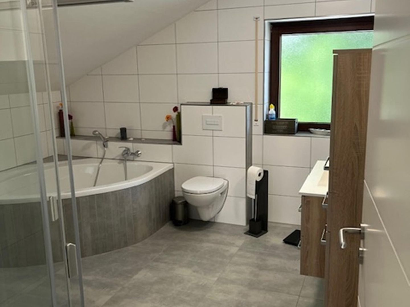 De badkamer is uitgerust met een douche, bad, wc en wastafel, evenals een wasmachine en een wasdroger.