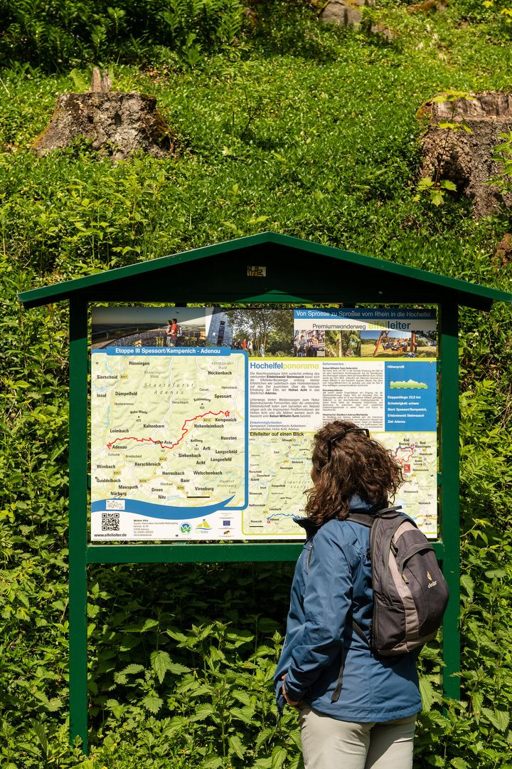 De weekendwandeling is ongeveer 53 kilometer lang en combineert drie landschappen. De EIFELLEITER begint in het schilderachtige Rijndal, beklimt het vurige vulkanische gebied van het Brohltal en bereikt het dromerige stadje Adenau via de hoogste top van de Eifel, de Hohe Acht (747 meter boven zeeniveau). De EIFELLEITER biedt op zijn drie etappes een schat aan landschappelijke hoogtepunten: Uitkijkpunten nodigen uit om in de verte te staren, natuurbelevenissen nodigen uit tot verwondering, vulkanisme en het vurige verleden van de Eifel worden tastbaar op deze wandelroute.