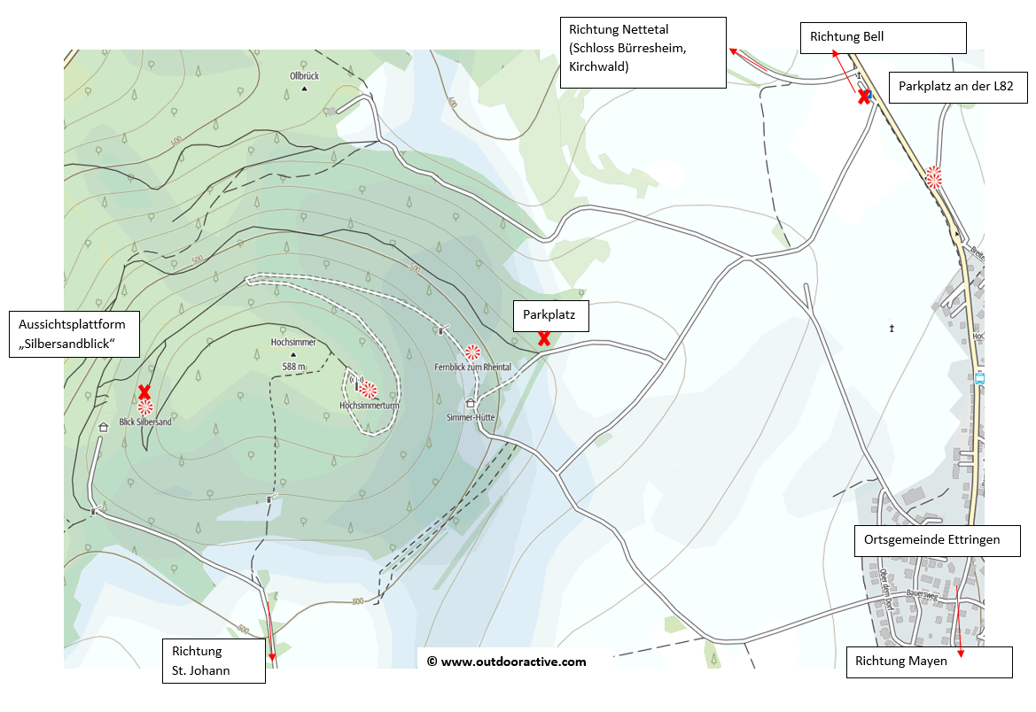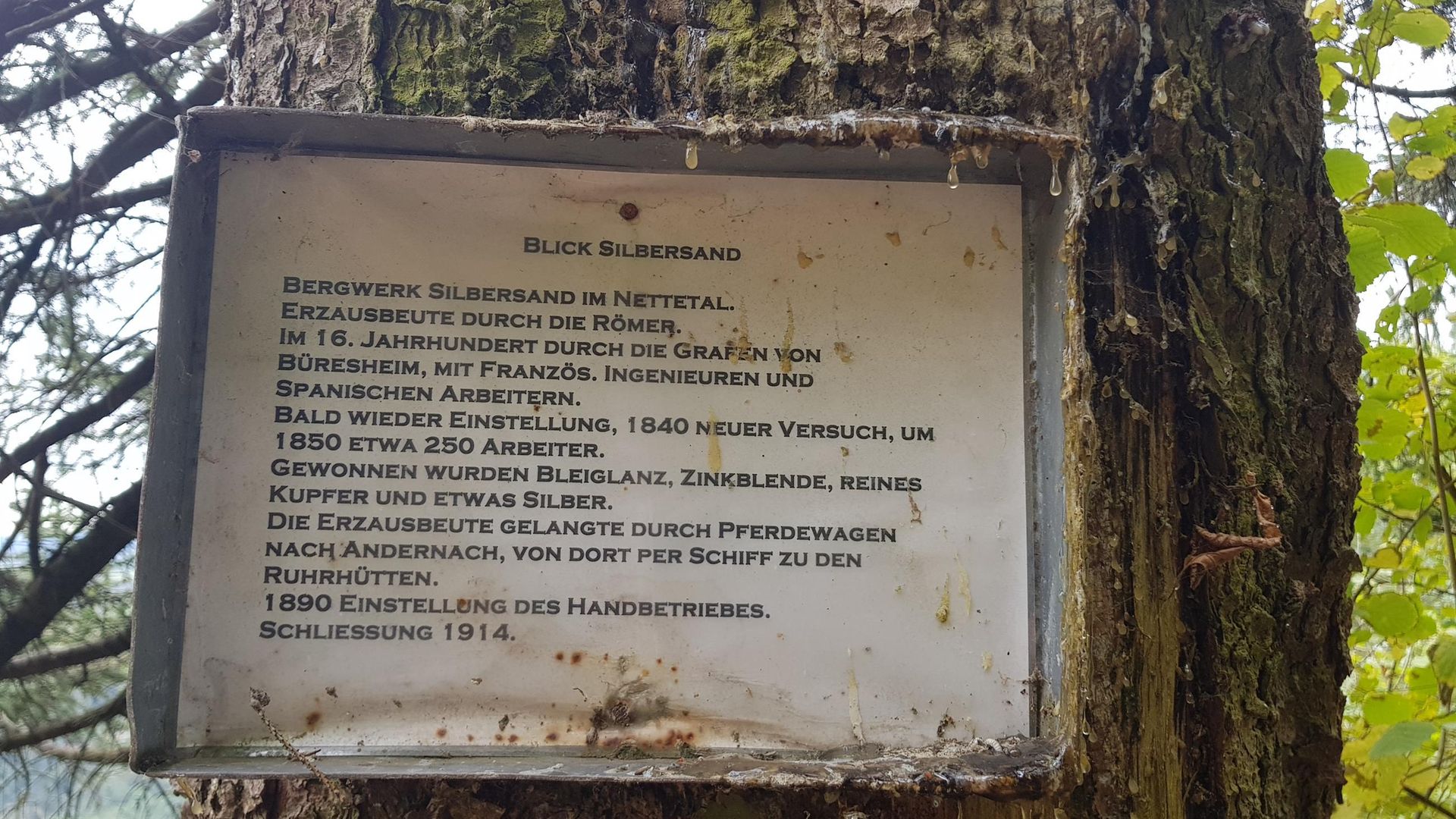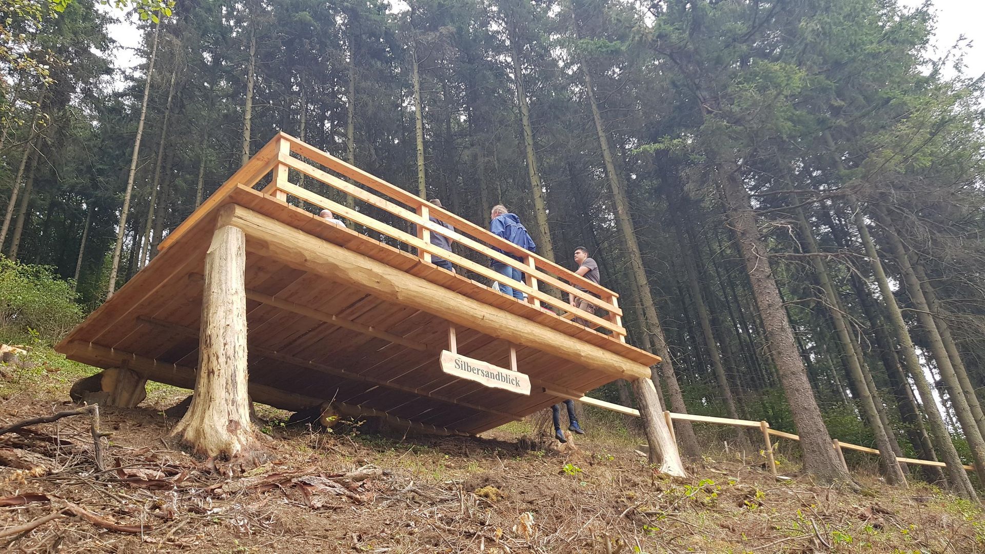 Die Kanzelgröße hat eine Fläche von 25 Quadratmetern und besteht nur aus heimischem Lärchenholz. Für den Bau war ein Zeitaufwand von 100 Stunden notwendig. Für die Wanderer, die durch den Forst streifen, die frische nach Holz und Moos riechende Luft einatmen, ist der Besuch des Bauwerkes unweigerlich ein „Muß“: Von dort hat man eine herrliche Aussicht auf die Eifelhöhen mit den schmucken Orten oder über das Nettetal bis hinauf zur weltbekannten Nürburg. Und dann etwas ganz Besonderes. Der Blick hin zu nahe liegenden Zeugen heimatlicher Vergangenheit in gar nicht weiter Entfernung. Hin zur ehemaligen Grube „Silbersand“. Sie war eines der wichtigsten Erzvorkommen in der Eifel. Halden und Pingen zeugen heute noch vom regen Bergbau. Wahrscheinlich bereits den Römern bekannt, wurden dort Blei- Kupfer- und Eisenerze nachweislich zwischen 1401 bis 1677 abgebaut. 1846 wurde der Betrieb auf „Silbersand“ wieder aufgenommen, um speziell die Halden mit ihren reichen Aphalerit-Vorräten zu nutzen. Aufgrund der Erzerschöpfung kam es 1914 zum Auflass der Grube. Zwischen 1957 und 1959 wurde der Louisenstollen abermals aufgewältigt, um Erze nochmals zu untersuchen. Es führte zum weiteren Abtransport von Haldenmaterial zu einer Aufbereitungsanlage.