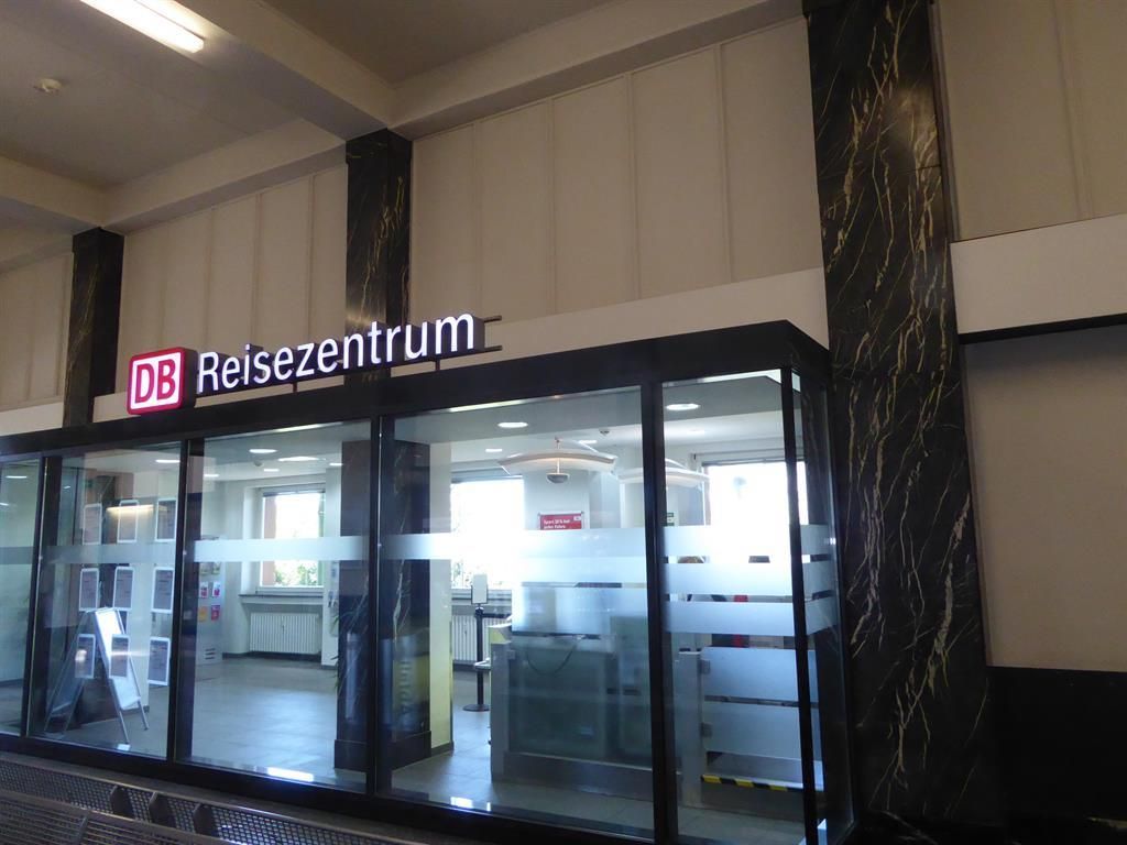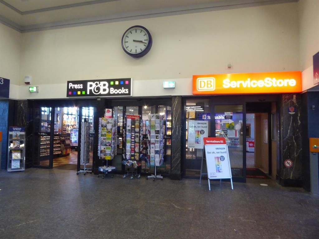 Im Bahnhofsgebäude befindet sich der Serviceschalter der Deutschen Bahn sowie ein Zeitschriftengeschäft, wo Sie unter anderem auch Fahrkarten erwerben können. Ebenso finden Sie im Bahnhofsgebäude ein kleines Café, welches verschiedene Backwaren anbietet. Die öffentliche Toilettenanlage steht Ihnen für 50 Cent zur Verfügung. Schließfächer zur Aufbewahrung von Gepäckstücken sind auch vorhanden.