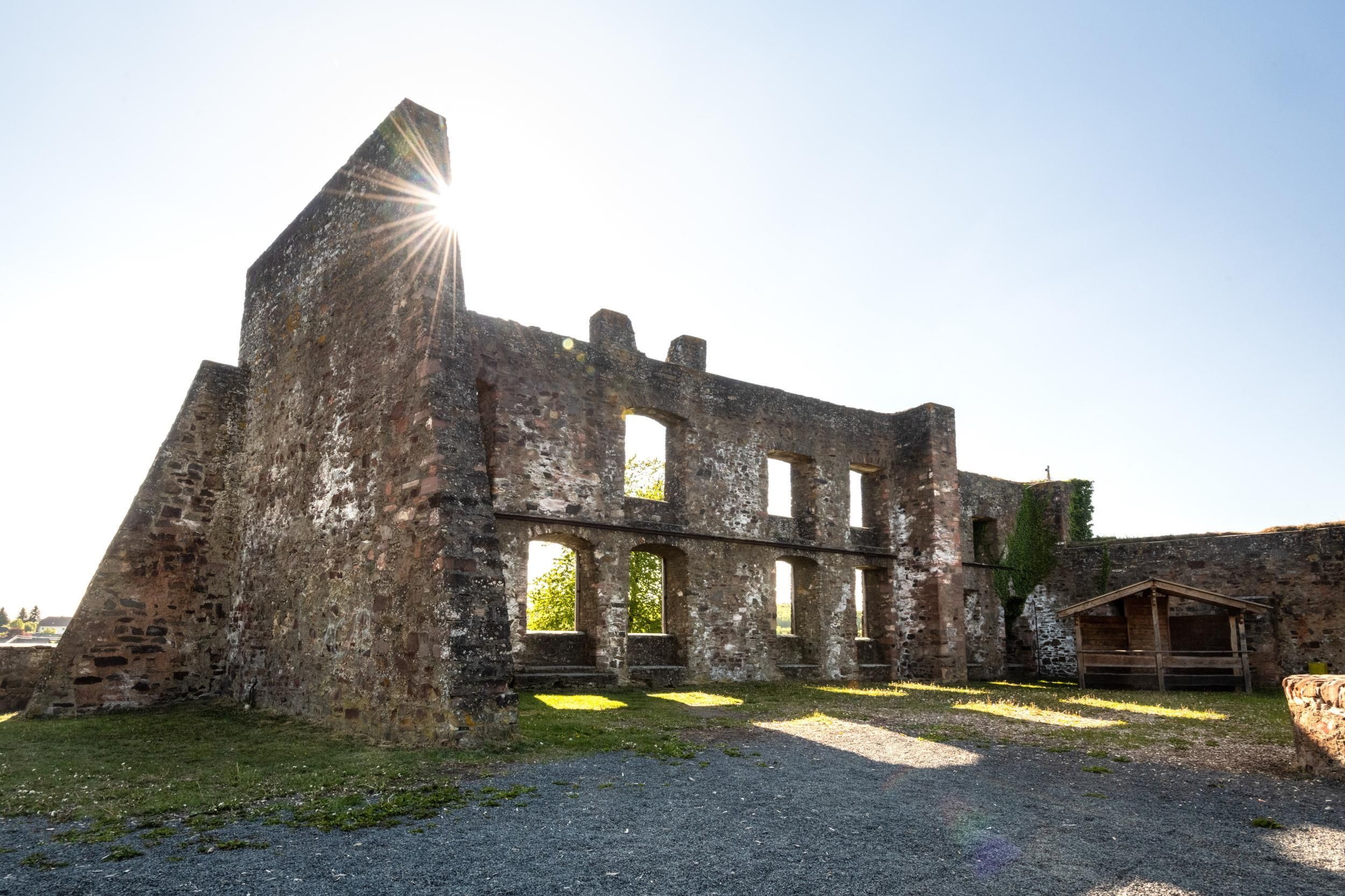 Die Unterburg ist gänzlich verschwunden. Zu erkennen sind noch Ansätze des Berings, der mit der Unterburg und der Stadtmauer Ulmens verbunden war, eine zwei Stockwerke aufragende Außenwand des Palas, sowie eine Zisterne und ein paar Grundmauern weiterer Gebäude. Der alte Teil der Burg in Ulmen wurde ca. 1.074 n. Chr. erbaut und ruht sehr wahrscheinlich auf Resten einer römischen Siedlung. Im Mittelalter wurde die Burg in Ulmen weiter ausgebaut und in die Oberburg, deren Mauerreste noch vorhanden sind und die Niederburg, die sich bis ans Maarufer erstreckte, unterteilt. Zwei Rittergeschlechte bewohnten die Burg, von der man ausgeht, dass sie bis 1673 aufgrund ihrer Größe nie angegriffen oder zerstört wurde. Erst die Truppen des Sonnenkönigs schafften dies. Sie wurde wieder aufgebaut, um 1689 erneut im Erbfolgekrieg zu fallen. Doch auch dieses Mal wurde die Ulmener Burg neu errichtet, nur die Stadtmauer wurde aufgegeben. Der Einfall der Soldaten Napoleons ließ auch Ulmen französisch werden und später preußisch. Die leerstehende Burg, deren letzter Nachkomme 1801 verstarb, ging bei einer Versteigerung an einen Cochemer Kaufmann, der sie als Steinbruch vermarktete. Als im 19. Jahrhundert ein verheerendes Feuer Ulmen niederbrannte bauten die Ulmener ihre Häuser mit Steinen der Burg wieder auf. Deshalb kann man noch heute an manchem Stall ein Wappen sehen. Erst Anfang des zwanzigsten Jahrhunderts wurde Die Ulmener Burg unter Denkmalschutz gestellt und kam in den Besitz der Ortsgemeinde Ulmen. Die Burg ist jederzeit frei zugänglich.