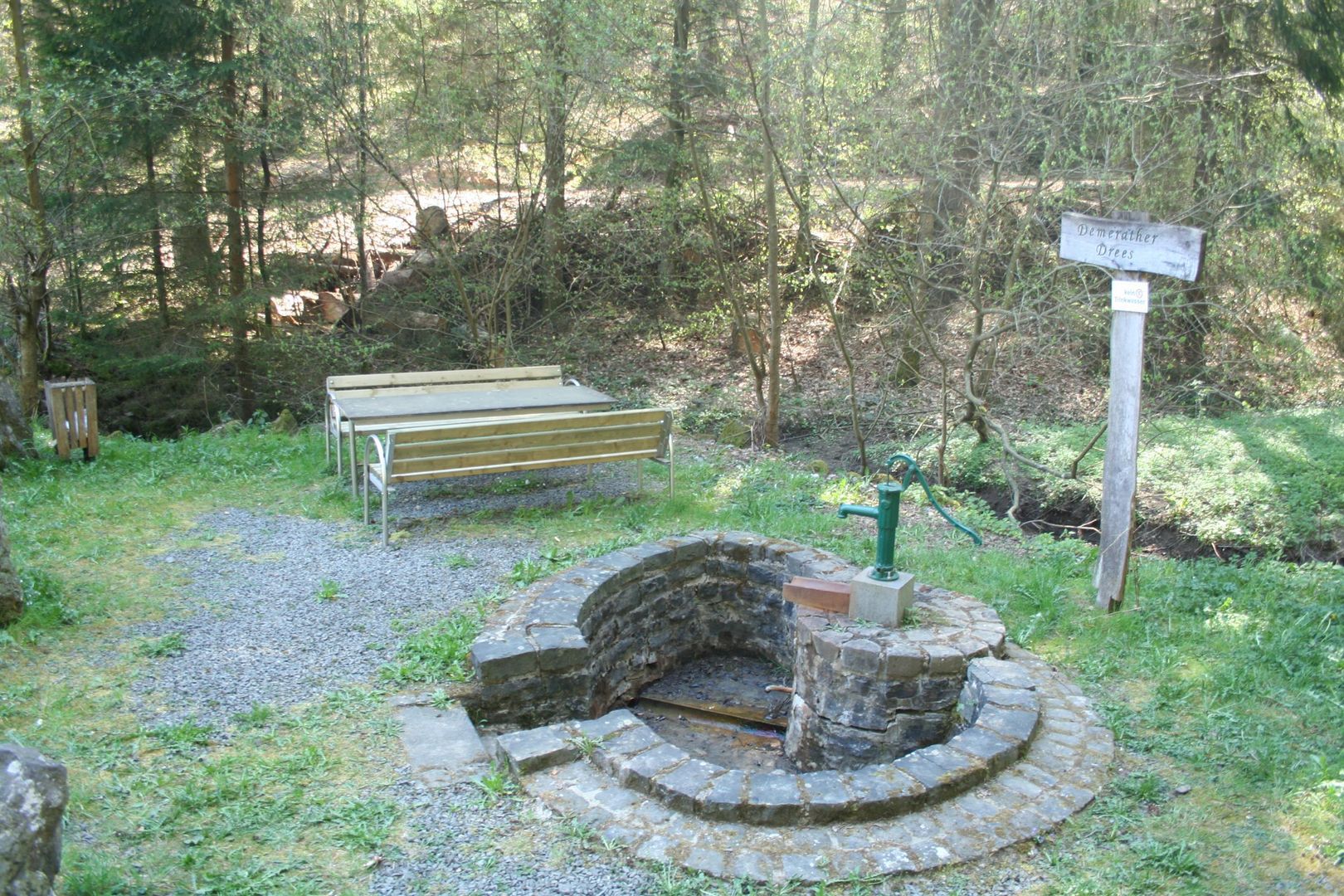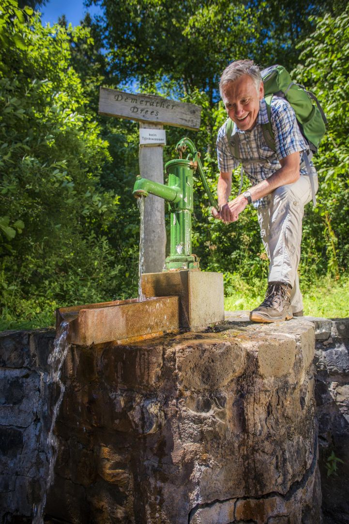 Die Besonderheit der Brunnenfassung am Demerather Drees ist die aufgesetzte Schwengelpumpe. Hier kannst du 8 Grad kaltes, mineralisches, kohlensäurehaltiges und stark eisenhaltiges Wasser zum Erfrischen pumpen.