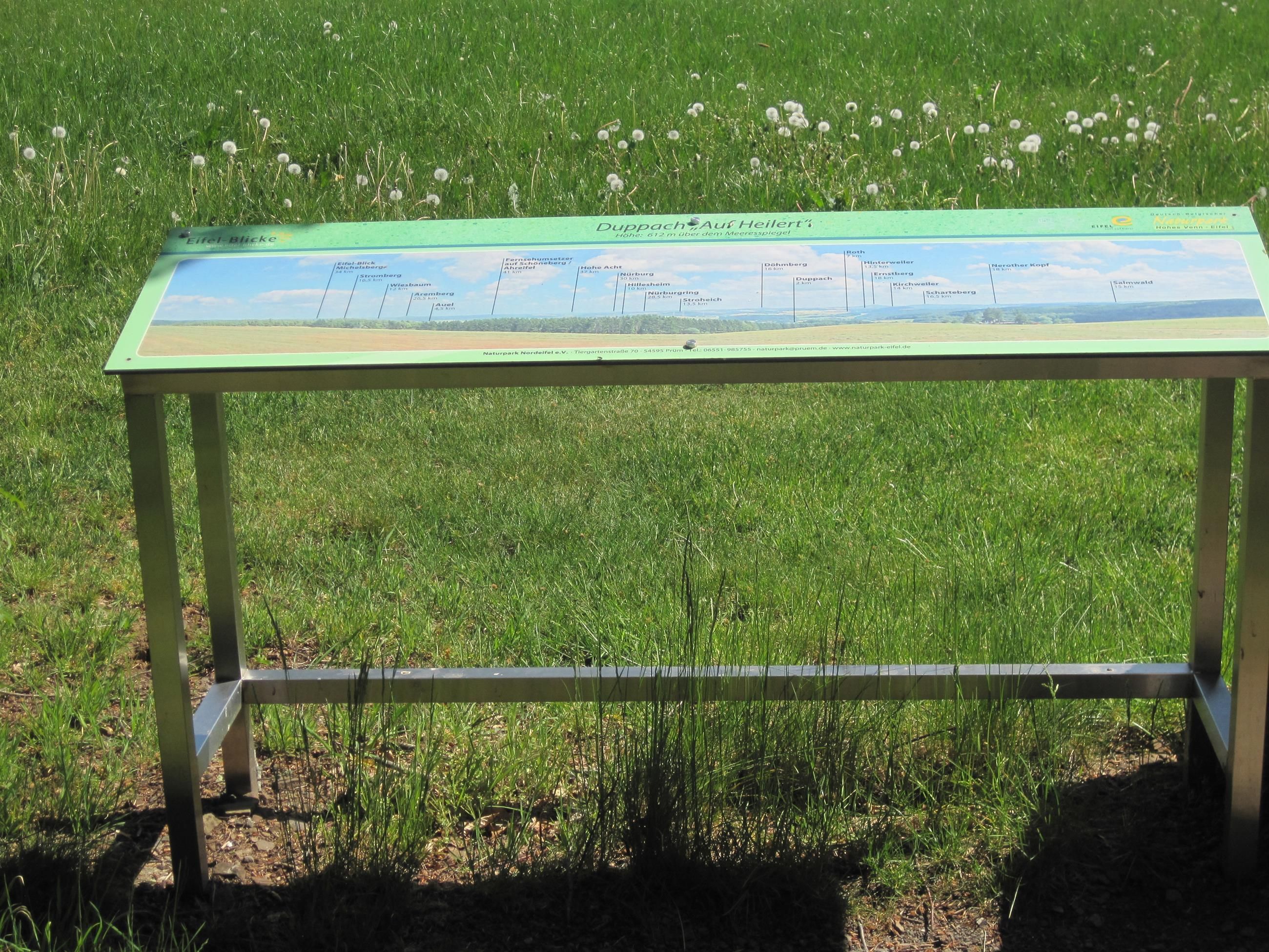 The Eifelblick ‘Auf Heilert’ is located on the ridge of the Duppach Ridge at an altitude of 612 metres above sea level. From here, you have an impressive view as far as the Nürburg with the Nürburgring. On a clear day, you can recognise the Michelsberg near Bad Münstereifel, which is around 35 km away. To the east, you can see the volcanic cones in the Gerolstein and Daun area, as well as the Salmwald mountain range.