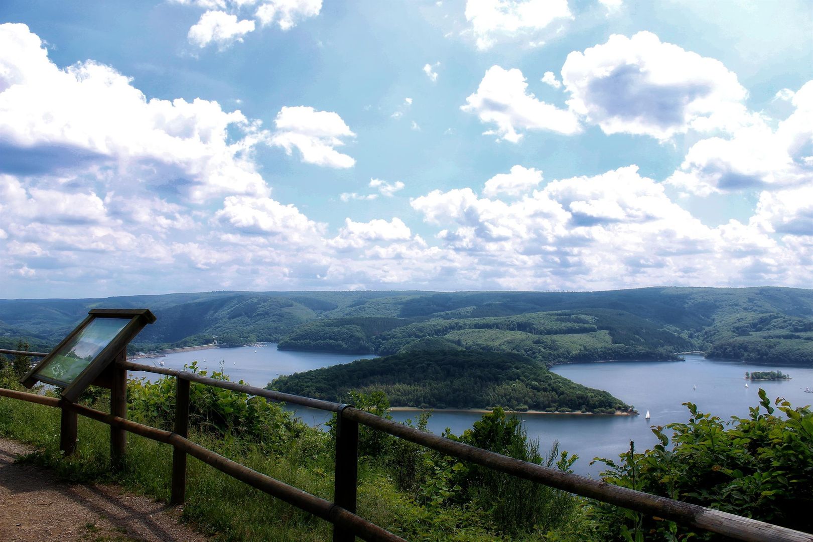 Der Eifel-Blick "Schöne Aussicht" auf der "Simonsley" (415 Meter über dem Meeresspiegel) bietet Ihnen oberhalb des Rursees in südost- bis südwestlicher Richtung einen beeindruckendes Panorama, wobei der "Kermeter", ein Kernbereich im Nationalpark Eifel, die Blicke auf sich zieht.