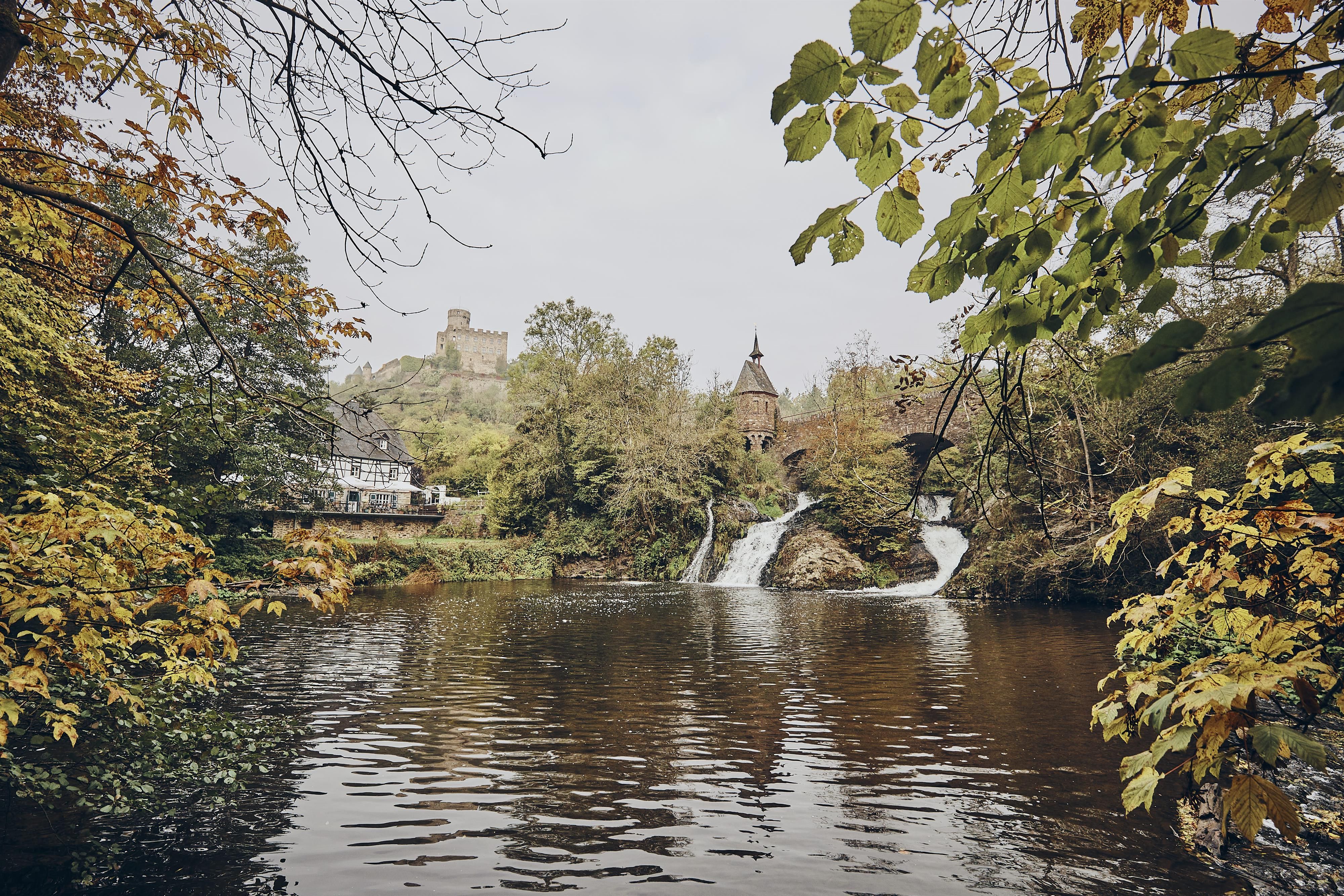Besonders beeindruckend ist der Wasserfall an der Pyrmonter Mühle – der größte Wasserfall der Eifel mit der Burg Pyrmont im Hintergrund. Dieses Plätzchen eignet sich hervorragend für eine kleine Rast während einer Wandertour.