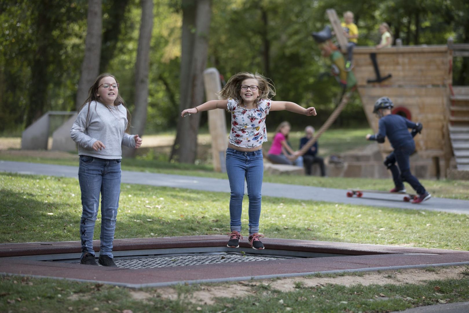 Ein großes Holz-Spielschiff, in den Boden eingelassene Trampoline und eine Vogelnestschaukel sowie Federspielgeräte für 5- bis 12-jährige Kinder.